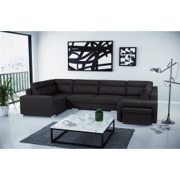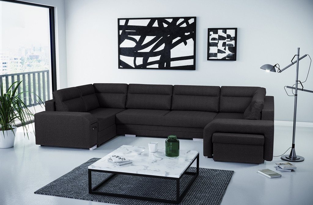Rohová sedací souprava ALVARES U do obývacího pokoje je navíc vybavena automatickým rozkládáním - rohová sedací souprava má funkci spaní, díky které se můžete spolehnout na bezpečný a pohodlný spánek. Rám nábytku je vyroben ze dřeva a poté je opatřen chromovanými nohami. K rohové sedací soupravě patří taburet - v nábytku je pro něj zabudováno speciální místo a praktický úložný prostor v podobě výsuvné zásuvky na drobné doplňky. Součástí sady jsou také polštáře umístěné na opěradle. Spací plocha modelu ALVARES U je vyplněna čalounickou pěnou T-30 a vlnitými pružinami. Kolem prezentované rohové sedací soupravy jistě nikdo neprojde lhostejně - nábytek je praktický pro každodenní použití a zároveň poskytuje pohodlí i při mnohahodinovém odpočinku.