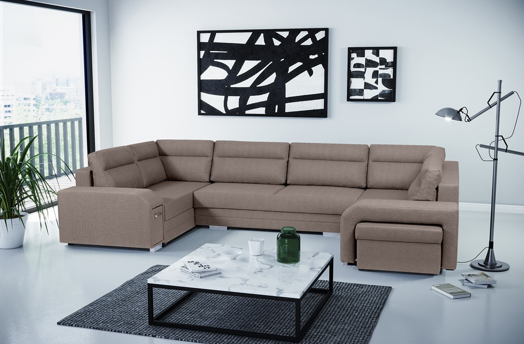 Rohová sedací souprava ALVARES U do obývacího pokoje je navíc vybavena automatickým rozkládáním - rohová sedací souprava má funkci spaní, díky které se můžete spolehnout na bezpečný a pohodlný spánek. Rám nábytku je vyroben ze dřeva a poté je opatřen chromovanými nohami. K rohové sedací soupravě patří taburet - v nábytku je pro něj zabudováno speciální místo a praktický úložný prostor v podobě výsuvné zásuvky na drobné doplňky. Součástí sady jsou také polštáře umístěné na opěradle. Spací plocha modelu ALVARES U je vyplněna čalounickou pěnou T-30 a vlnitými pružinami. Kolem prezentované rohové sedací soupravy jistě nikdo neprojde lhostejně - nábytek je praktický pro každodenní použití a zároveň poskytuje pohodlí i při mnohahodinovém odpočinku.