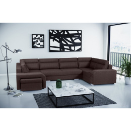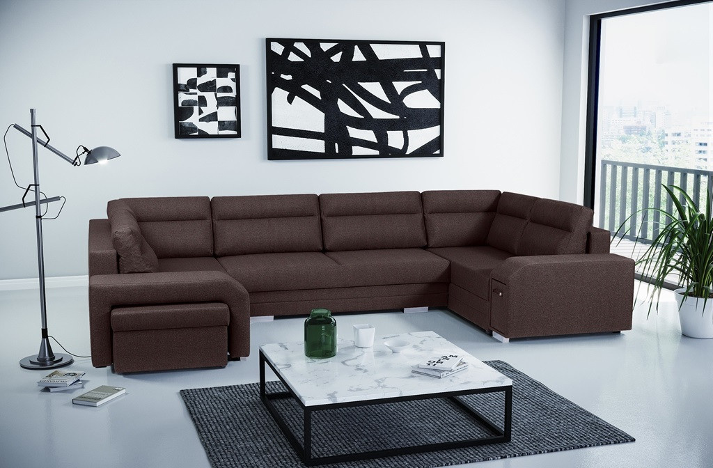 Rohová sedací souprava ALVARES U do obývacího pokoje je navíc vybavena automatickým rozkládáním - rohová sedací souprava má funkci spaní, díky které se můžete spolehnout na bezpečný a pohodlný spánek. Rám nábytku je vyroben ze dřeva a poté je opatřen chromovanými nohami. K rohové sedací soupravě patří taburet - v nábytku je pro něj zabudováno speciální místo a praktický úložný prostor v podobě výsuvné zásuvky na drobné doplňky. Součástí sady jsou také polštáře umístěné na opěradle. Spací plocha modelu ALVARES U je vyplněna čalounickou pěnou T-30 a vlnitými pružinami. Kolem prezentované rohové sedací soupravy jistě nikdo neprojde lhostejně - nábytek je praktický pro každodenní použití a zároveň poskytuje pohodlí i při mnohahodinovém odpočinku.
