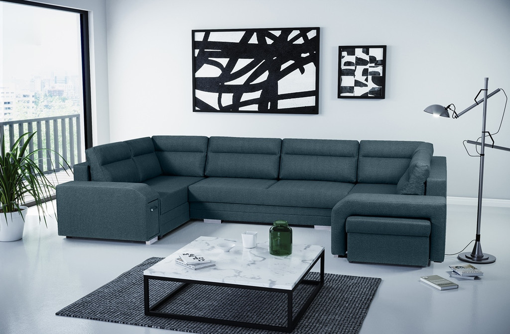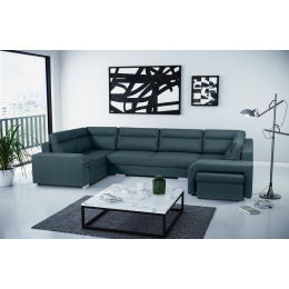 Rohová sedací souprava ALVARES U do obývacího pokoje je navíc vybavena automatickým rozkládáním - rohová sedací souprava má funkci spaní, díky které se můžete spolehnout na bezpečný a pohodlný spánek. Rám nábytku je vyroben ze dřeva a poté je opatřen chromovanými nohami. K rohové sedací soupravě patří taburet - v nábytku je pro něj zabudováno speciální místo a praktický úložný prostor v podobě výsuvné zásuvky na drobné doplňky. Součástí sady jsou také polštáře umístěné na opěradle. Spací plocha modelu ALVARES U je vyplněna čalounickou pěnou T-30 a vlnitými pružinami. Kolem prezentované rohové sedací soupravy jistě nikdo neprojde lhostejně - nábytek je praktický pro každodenní použití a zároveň poskytuje pohodlí i při mnohahodinovém odpočinku.