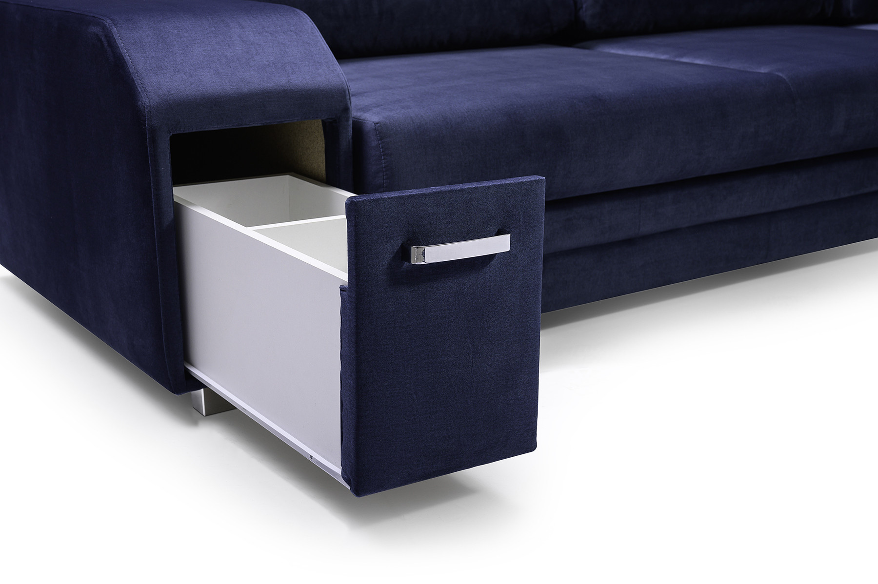 ALVARES je elegantní rohová sedací souprava ve tvaru písmene L s bočnicemi, která upoutá pozornost chromovanými nožičkami a úchytem spojeným s praktickým úložným prostorem na drobné doplňky. Stabilní konstrukce v podobě dřevěného rámu je k dispozici v pravostranném nebo levostranném provedení, takže si každý zákazník může prezentovaný model přizpůsobit individuálním preferencím i prostorovým možnostem. Rozkládací rohová sedací souprava je vybavena automatickým rozkládáním, díky kterému budete moci efektivně nahlédnout do dvou úložných prostorů na lůžkoviny a rohovou sedací soupravu rozložit. Zajímavým prvkem je zabudovaný prostor pro taburet v rohu, který je součástí soupravy, stejně jako ozdobné polštářky umístěné na mírně tvarovaném opěradle. Stylová rohová pohovka ALVARES s funkcí spaní je vyplněna vlnitými pružinami a čalounickou pěnou T-30, které zajišťují odpovídající odolnost a pružnost sedáku nebo opěráku. Představená rohová sedací souprava je celá čalouněná působivě vypadající látkou - je k dispozici v široké škále barev.