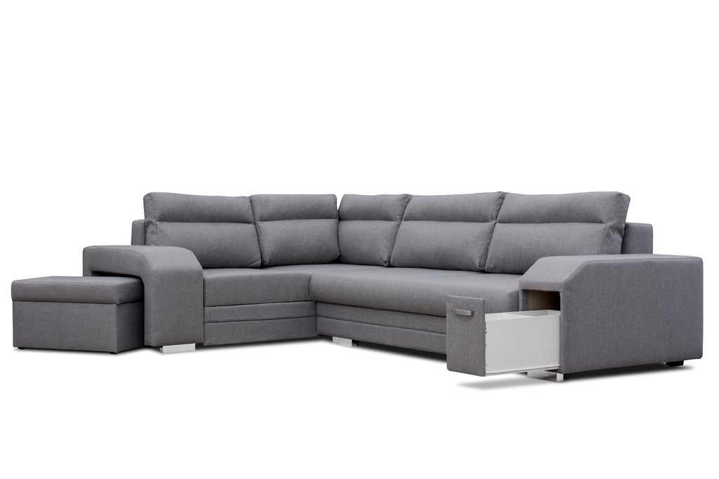ALVARES je elegantní rohová sedací souprava ve tvaru písmene L s bočnicemi, která upoutá pozornost chromovanými nožičkami a úchytem spojeným s praktickým úložným prostorem na drobné doplňky. Stabilní konstrukce v podobě dřevěného rámu je k dispozici v pravostranném nebo levostranném provedení, takže si každý zákazník může prezentovaný model přizpůsobit individuálním preferencím i prostorovým možnostem. Rozkládací rohová sedací souprava je vybavena automatickým rozkládáním, díky kterému budete moci efektivně nahlédnout do dvou úložných prostorů na lůžkoviny a rohovou sedací soupravu rozložit. Zajímavým prvkem je zabudovaný prostor pro taburet v rohu, který je součástí soupravy, stejně jako ozdobné polštářky umístěné na mírně tvarovaném opěradle. Stylová rohová pohovka ALVARES s funkcí spaní je vyplněna vlnitými pružinami a čalounickou pěnou T-30, které zajišťují odpovídající odolnost a pružnost sedáku nebo opěráku. Představená rohová sedací souprava je celá čalouněná působivě vypadající látkou - je k dispozici v široké škále barev.