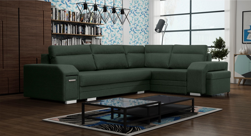 ALVARES je elegantní rohová sedací souprava ve tvaru písmene L s bočnicemi, která upoutá pozornost chromovanými nožičkami a úchytem spojeným s praktickým úložným prostorem na drobné doplňky. Stabilní konstrukce v podobě dřevěného rámu je k dispozici v pravostranném nebo levostranném provedení, takže si každý zákazník může prezentovaný model přizpůsobit individuálním preferencím i prostorovým možnostem. Rozkládací rohová sedací souprava je vybavena automatickým rozkládáním, díky kterému budete moci efektivně nahlédnout do dvou úložných prostorů na lůžkoviny a rohovou sedací soupravu rozložit. Zajímavým prvkem je zabudovaný prostor pro taburet v rohu, který je součástí soupravy, stejně jako ozdobné polštářky umístěné na mírně tvarovaném opěradle. Stylová rohová pohovka ALVARES s funkcí spaní je vyplněna vlnitými pružinami a čalounickou pěnou T-30, které zajišťují odpovídající odolnost a pružnost sedáku nebo opěráku. Představená rohová sedací souprava je celá čalouněná působivě vypadající látkou - je k dispozici v široké škále barev.