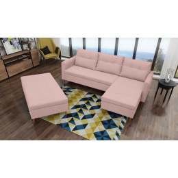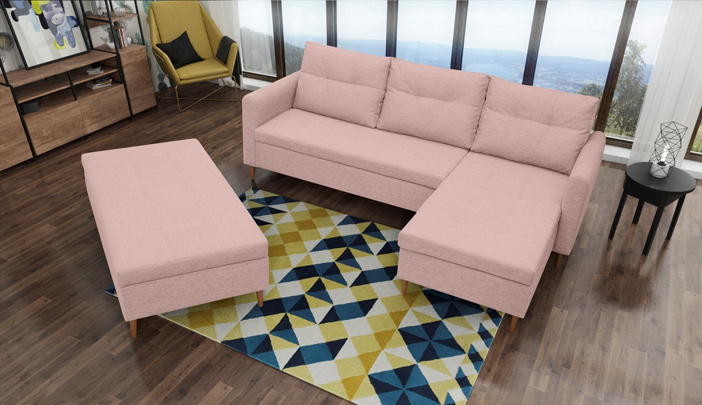 Stylová pohovka AREO s praktickým taburetem je nábytek, který upoutá pozornost svým dekorativním prošíváním. Rohová sedací souprava s praktickými bočnicemi je k dispozici v pravém nebo levém provedení podle vašeho výběru. Po přidání taburetu k rohové pohovce můžete získat funkci spaní. Rohová sedací souprava dokončená ve skandinávském stylu je kus nábytku s čalouněným opěradlem, tedy volně stojící kus nábytku, díky čemuž lze rohovou sedací soupravu umístit nejen ke stěně místnosti, ale i do její střední části. Podstavec prezentované rohové pohovky a taburetu je vyroben z přírodního dřeva. Sedák je vyplněn vlnitou pružinou, která pomáhá udržet odpovídající pružnost konstrukce - ani přes opakované používání se na něm neobjevují nevzhledné deformace. K rohové pohovce a pufu AREO jsou dodávány dva dekorační polštáře. Praktický taburet má schránku na lůžkoviny nebo drobné každodenní doplňky. Nábytek AREO lze čalounit látkou, jejíž barvy lze vybrat z dostupného vzorníku barev.