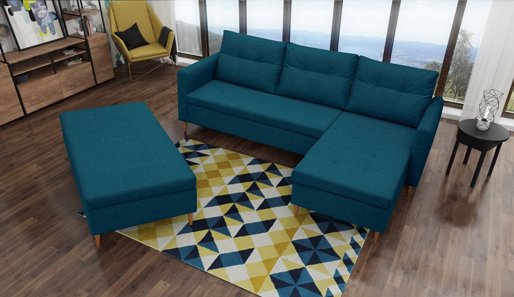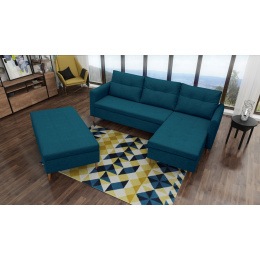 Stylová pohovka AREO s praktickým taburetem je nábytek, který upoutá pozornost svým dekorativním prošíváním. Rohová sedací souprava s praktickými bočnicemi je k dispozici v pravém nebo levém provedení podle vašeho výběru. Po přidání taburetu k rohové pohovce můžete získat funkci spaní. Rohová sedací souprava dokončená ve skandinávském stylu je kus nábytku s čalouněným opěradlem, tedy volně stojící kus nábytku, díky čemuž lze rohovou sedací soupravu umístit nejen ke stěně místnosti, ale i do její střední části. Podstavec prezentované rohové pohovky a taburetu je vyroben z přírodního dřeva. Sedák je vyplněn vlnitou pružinou, která pomáhá udržet odpovídající pružnost konstrukce - ani přes opakované používání se na něm neobjevují nevzhledné deformace. K rohové pohovce a pufu AREO jsou dodávány dva dekorační polštáře. Praktický taburet má schránku na lůžkoviny nebo drobné každodenní doplňky. Nábytek AREO lze čalounit látkou, jejíž barvy lze vybrat z dostupného vzorníku barev.