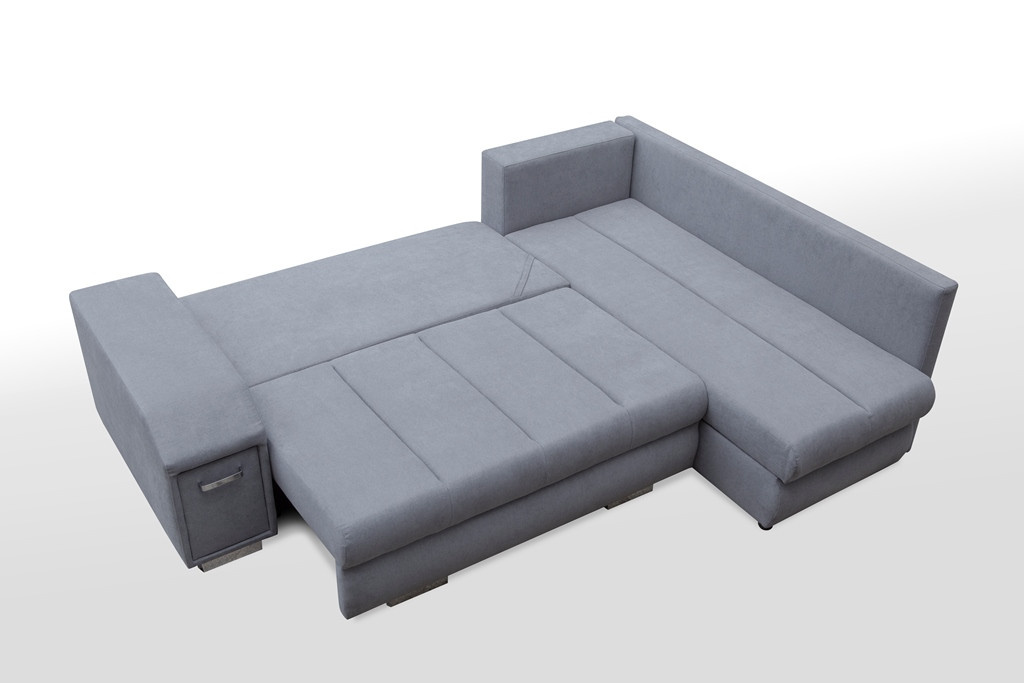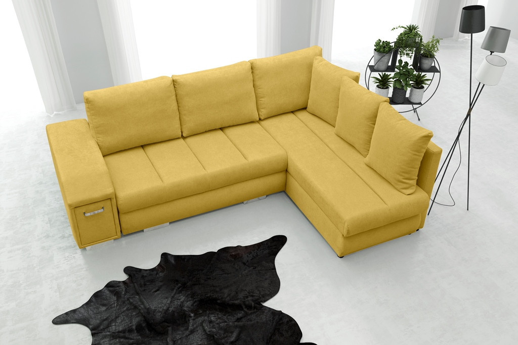 Rozkládací rohová pohovka ARNI s bočnicemi je k dispozici v pravostranném nebo levostranném provedení podle vašeho výběru. Rohová sedací souprava ve tvaru písmene L pro více osob najde své ideální místo v relaxačním a zároveň reprezentativním prostoru, například v obývacím pokoji - bude to kus nábytku zaručující pohodlí i při mnohahodinovém sezení. Model ARNI je vybaven spací funkcí, která nám umožní pohodlně a bezpečně ubytovat naše hosty. Nábytek je navržen s automatickým rozkládáním. Rohová sedací souprava je vyrobena na dřevěném rámu a čalouněna látkou, která je k dispozici v široké škále barev, z nichž si můžete vybrat. Stylová rohová sedací souprava s čalouněnými zády má dva prostorné úložné prostory na lůžkoviny a výsuvnou zásuvku se dvěma přihrádkami umístěnou v boční části, kam si můžete uložit věci, které potřebujete mít při odpočinku po ruce.