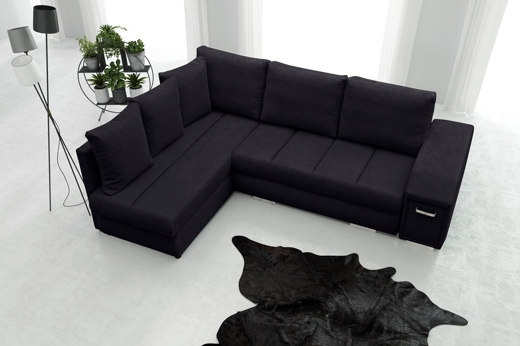 Rozkládací rohová pohovka ARNI s bočnicemi je k dispozici v pravostranném nebo levostranném provedení podle vašeho výběru. Rohová sedací souprava ve tvaru písmene L pro více osob najde své ideální místo v relaxačním a zároveň reprezentativním prostoru, například v obývacím pokoji - bude to kus nábytku zaručující pohodlí i při mnohahodinovém sezení. Model ARNI je vybaven spací funkcí, která nám umožní pohodlně a bezpečně ubytovat naše hosty. Nábytek je navržen s automatickým rozkládáním. Rohová sedací souprava je vyrobena na dřevěném rámu a čalouněna látkou, která je k dispozici v široké škále barev, z nichž si můžete vybrat. Stylová rohová sedací souprava s čalouněnými zády má dva prostorné úložné prostory na lůžkoviny a výsuvnou zásuvku se dvěma přihrádkami umístěnou v boční části, kam si můžete uložit věci, které potřebujete mít při odpočinku po ruce.