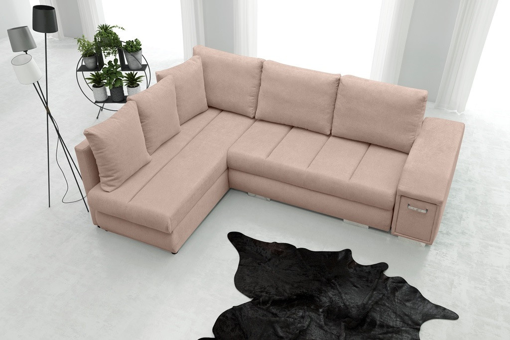 Rozkládací rohová pohovka ARNI s bočnicemi je k dispozici v pravostranném nebo levostranném provedení podle vašeho výběru. Rohová sedací souprava ve tvaru písmene L pro více osob najde své ideální místo v relaxačním a zároveň reprezentativním prostoru, například v obývacím pokoji - bude to kus nábytku zaručující pohodlí i při mnohahodinovém sezení. Model ARNI je vybaven spací funkcí, která nám umožní pohodlně a bezpečně ubytovat naše hosty. Nábytek je navržen s automatickým rozkládáním. Rohová sedací souprava je vyrobena na dřevěném rámu a čalouněna látkou, která je k dispozici v široké škále barev, z nichž si můžete vybrat. Stylová rohová sedací souprava s čalouněnými zády má dva prostorné úložné prostory na lůžkoviny a výsuvnou zásuvku se dvěma přihrádkami umístěnou v boční části, kam si můžete uložit věci, které potřebujete mít při odpočinku po ruce.