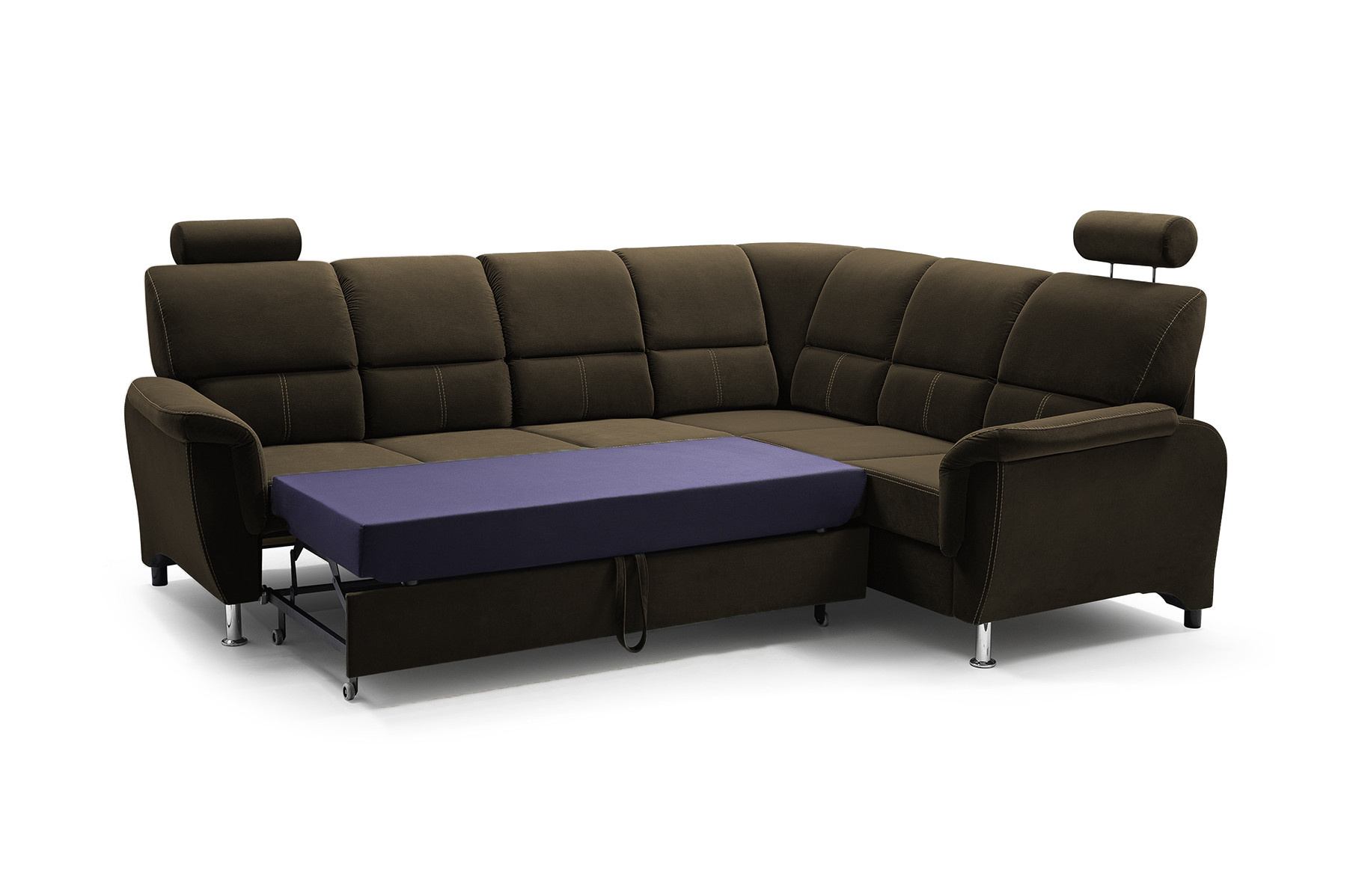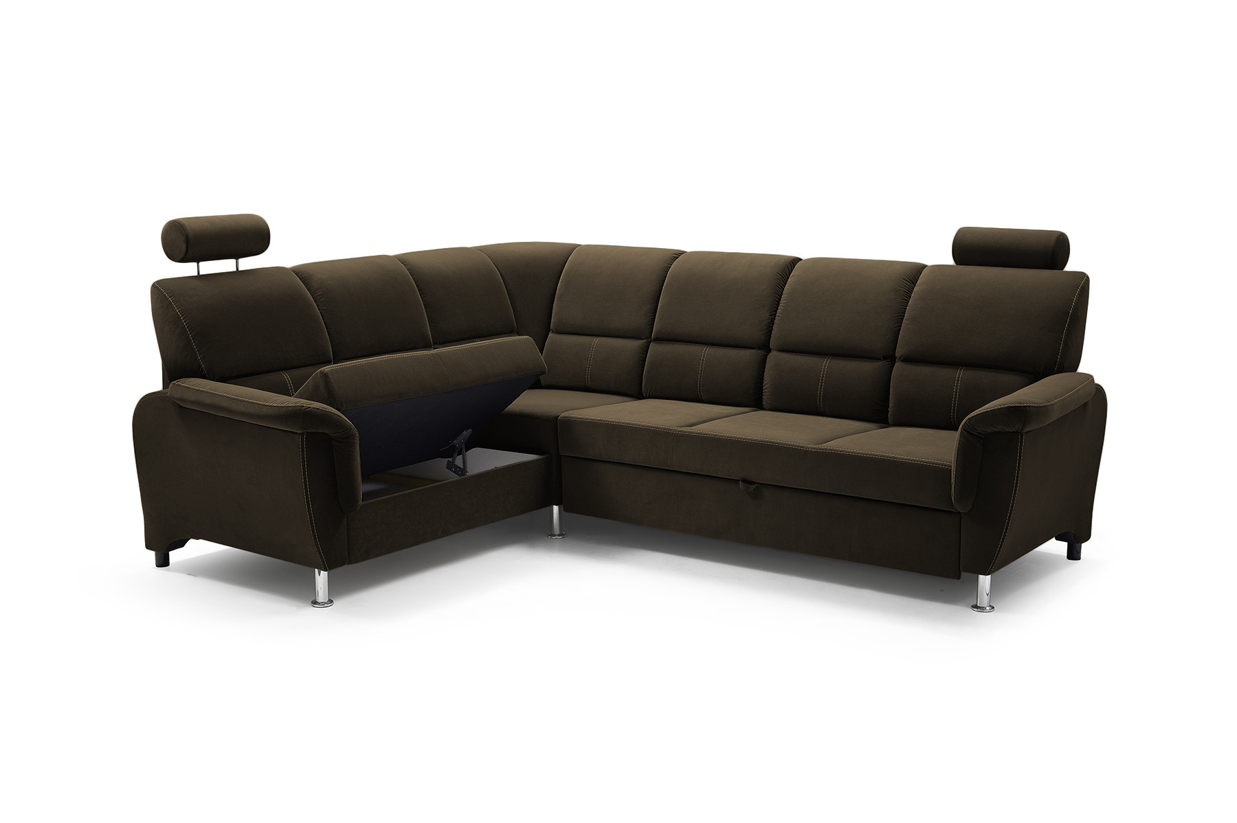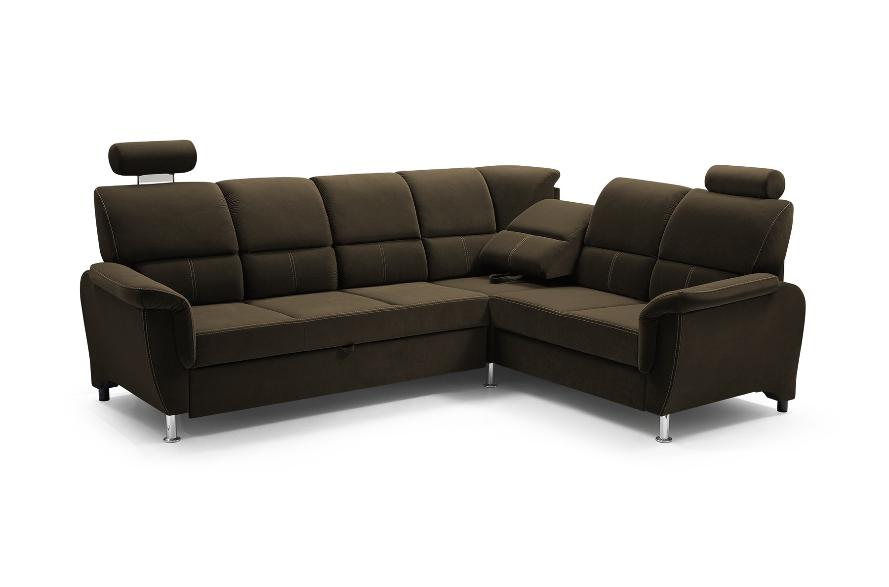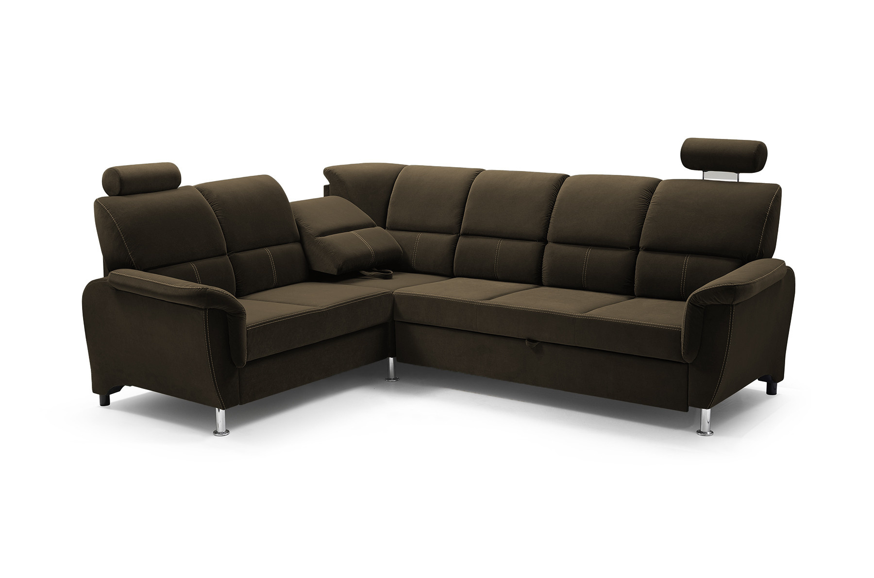 Rozkládací rohová pohovka DIANA s funkcí TV je vysoce estetický kus nábytku, který najde své dokonalé místo v obývacím pokoji pro volný čas. Úhledná rohová sedací souprava se dvěma opěrkami hlavy zaujme na první pohled dekorativním prošíváním, které dodává nábytku mimořádně luxusní charakter. Rohová sedací souprava s bočnicemi je k dispozici v pravostranném nebo levostranném provedení podle vašeho výběru, takže ji každý může přizpůsobit uspořádanému interiéru. Rohová pohovka pro více osob s funkcí spaní je vybavena výsuvným opěradlem, na které si můžete volně lehnout a sledovat film nebo televizní seriál v pololeže. Model DIANA má navíc nádobu na lůžkoviny a funkci spaní, takže můžete snadno a bezpečně ubytovat přátele a pozvané hosty. Nábytek umístěný na dřevěném rámu je vyplněn čalounickou pěnou a vlnitou pružinou, díky níž nejsou vidět žádné deformace ani po hodinách sezení. Originálním akcentem rohové sedací soupravy DIANA jsou chromové nožky, které podtrhují stylový akcent nábytku. Elegantní rohová sedací souprava je volně stojící kus nábytku, proto má čalouněná záda - lze ji snadno umístit i do střední části místnosti, nejen ke stěně. Barevné provedení nábytku lze vybrat podle individuálního vkusu z rozsáhlého vzorníku barev.