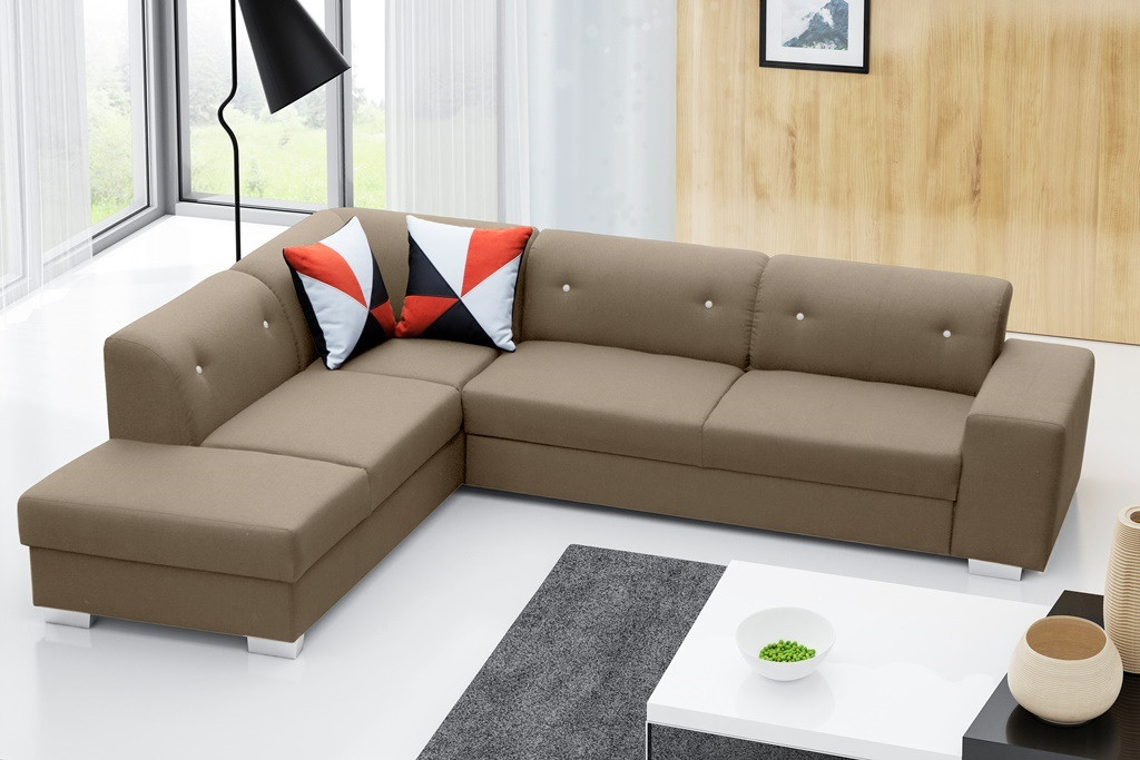 DIDI je moderní rohová sedací souprava ve tvaru písmene L, která je vybavena praktickým kontejnerem na lůžkoviny a funkcí spaní, díky níž budeme moci pohodlně a komfortně ubytovat pozvané hosty. Rohová sedací souprava bude nejen ideálním prvkem obývacího pokoje, ale také obývacího pokoje, protože se v noci může proměnit v pohodlné lůžko. Volně stojící kus nábytku má čalouněná záda, takže jej lze umístit nejen ke stěně, ale i do centrální části místnosti. K rohové pohovce DIDI jsou k dispozici dva dekorační polštáře, které podtrhují modernistický charakter designu. Rozkládací rohová sedací souprava s dřevěným rámem je podepřena chromovanými nohami, které jsou nejen zajímavým stylistickým akcentem, ale také zajišťují dostatečnou stabilitu a odolnost nábytku. Zde představená rohová sedací souprava je k dispozici v pravostranném nebo levostranném provedení, takže si ji každý bude moci přizpůsobit svým individuálním preferencím. Rohová jednostranná pohovka je vyplněna čalounickou pěnou a vlnitou pružinou, které jí zaručují dostatečnou pružnost.