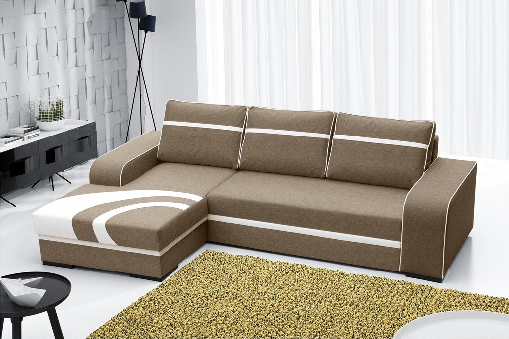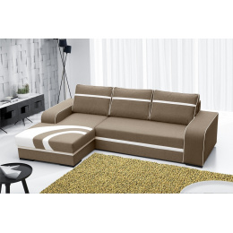 Moderní rohová sedací souprava FLORES je určena pro více osob a osloví i ty nejnáročnější uživatele. Rohová souprava ve tvaru L je k dispozici v pravostranném nebo levostranném provedení, takže si ho každý může přizpůsobit uspořádání místnosti. Volně stojící rohová sedací souprava se vyznačuje čalouněnými zády, díky nimž ji lze umístit nejen k obývací stěně, ale i do její střední části. Rohová sedací souprava FLORES s bočnicemi je vybavena funkcí spaní, která umožňuje nábytek rozložit, a také prostornou schránkou na lůžkoviny, do které se snadno vejdou polštáře, přikrývky a deky pro příjemný, pohodlný a bezpečný spánek. Elegantní rohová pohovka s dřevěným rámem se vyznačuje zvýšenou odolností a stabilitou, a to i přes každodenní používání. Nábytek stojí na dřevěných nohách z tmavého ořechu. Moderní rohová sedací souprava s mírně profilovaným opěradlem je vyplněna čalounickou pěnou a vlnitými pružinami, díky nimž se na modelu FLORES neobjeví žádné nevzhledné deformace. Volně stojící rohovou pohovku do obývacího pokoje lze čalounit látkou, která je k dispozici v široké škále barev. FLORES v základní verzi je vybaven vložkami z bílé ekokůže - na výběr je i z jiných látek. Stylová rohová pohovka ve tvaru písmene L zaujme atraktivním designem, který se skvěle hodí do obývacího pokoje zařízeného v moderním estetickém stylu.