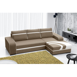 Moderní rohová sedací souprava FLORES je určena pro více osob a osloví i ty nejnáročnější uživatele. Rohová souprava ve tvaru L je k dispozici v pravostranném nebo levostranném provedení, takže si ho každý může přizpůsobit uspořádání místnosti. Volně stojící rohová sedací souprava se vyznačuje čalouněnými zády, díky nimž ji lze umístit nejen k obývací stěně, ale i do její střední části. Rohová sedací souprava FLORES s bočnicemi je vybavena funkcí spaní, která umožňuje nábytek rozložit, a také prostornou schránkou na lůžkoviny, do které se snadno vejdou polštáře, přikrývky a deky pro příjemný, pohodlný a bezpečný spánek. Elegantní rohová pohovka s dřevěným rámem se vyznačuje zvýšenou odolností a stabilitou, a to i přes každodenní používání. Nábytek stojí na dřevěných nohách z tmavého ořechu. Moderní rohová sedací souprava s mírně profilovaným opěradlem je vyplněna čalounickou pěnou a vlnitými pružinami, díky nimž se na modelu FLORES neobjeví žádné nevzhledné deformace. Volně stojící rohovou pohovku do obývacího pokoje lze čalounit látkou, která je k dispozici v široké škále barev. FLORES v základní verzi je vybaven vložkami z bílé ekokůže - na výběr je i z jiných látek. Stylová rohová pohovka ve tvaru písmene L zaujme atraktivním designem, který se skvěle hodí do obývacího pokoje zařízeného v moderním estetickém stylu.