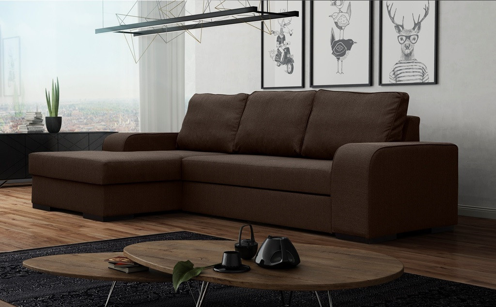 Rohová sedací souprava FRUGO s bočnicemi je volně stojící kus nábytku, který se bude skvěle vyjímat jak u stěny, tak uprostřed místnosti. Rohová sedací souprava ve tvaru písmene L je k dispozici v pravostranném nebo levostranném provedení, takže si ji každý může přizpůsobit individuálním preferencím a tvaru zařízené místnosti. Rozkládací rohová pohovka je vybavena prostorným kontejnerem na lůžkoviny, do kterého se vejdou přikrývky, deky a polštáře a další potřebné věci. Rohová sedací souprava FRUGO s funkcí spaní umožňuje rozložit nábytek a pohodlně ubytovat hosty. Konstrukci modelu FRUGO tvoří dřevěný rám a dřevěné nohy, zatímco výplň nábytku tvoří vlnitá pružina a čalounická pěna. Součástí rohové sedací soupravy FRUGO jsou dekorační polštáře, které nejenže dodávají nábytku moderní nádech, ale také maximalizují pohodlí při sezení. Představený model FRUGO je nábytek vyrobený na zakázku, který lze plně přizpůsobit individuálním preferencím.