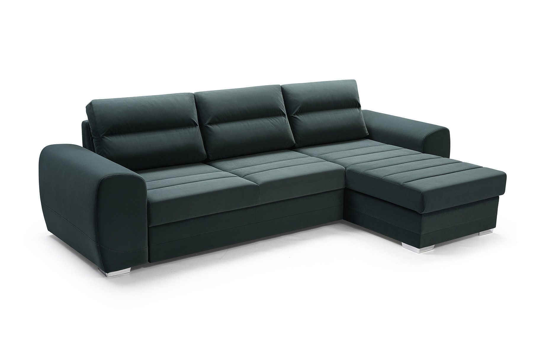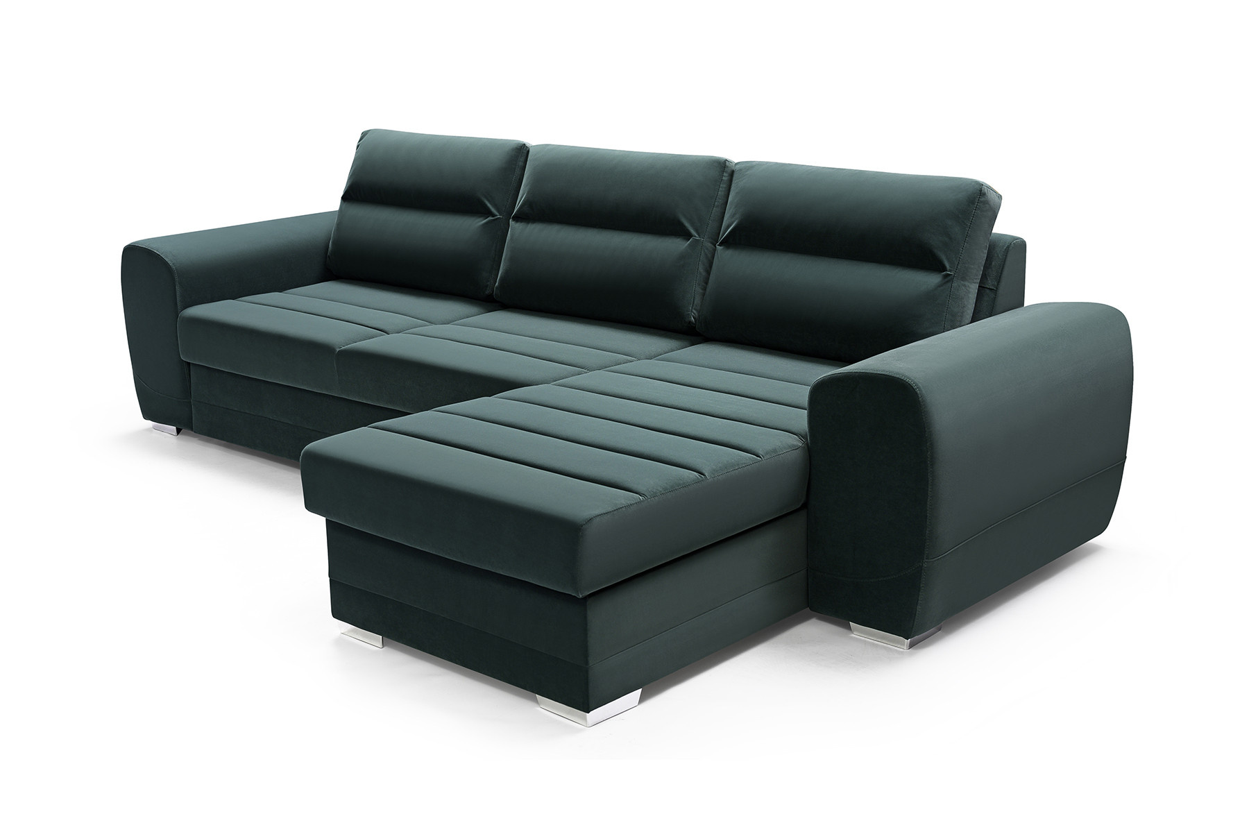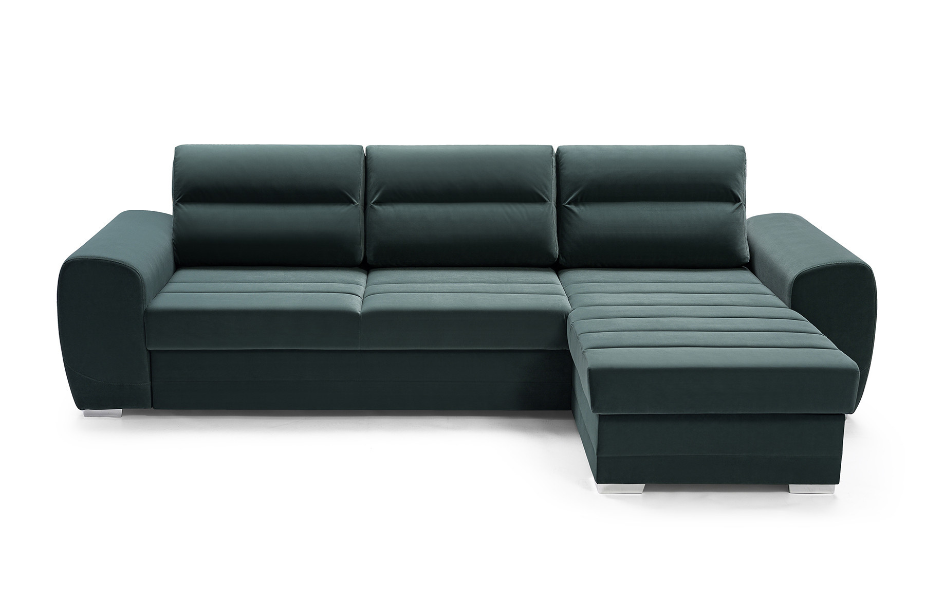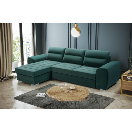 KIRI je rozkládací třímístná rohová pohovka, která je k dispozici v pravém nebo levém provedení. Rohová sedací souprava s bočnicemi ve tvaru písmene L zaujme na první pohled dekorativním prošíváním viditelným na sedáku, které jí dodává elegantní charakter. Moderní rohová sedací souprava KIRI se bude skvěle vyjímat v prostoru obývacího pokoje. Široká škála barev, která je k dispozici ve vzorníku, vám umožní přizpůsobit rohovou sedací soupravu vašemu individuálnímu vkusu. Dřevěný rám a chromované nohy poskytují nábytku odpovídající odolnost, pevnost a stabilitu. Elegantní rohová sedací souprava KIRI je rozkládací rohovka, díky které budete moci nejen odpočívat s rodinou, ale také ubytovat své hosty. Rohová sedací souprava je vybavena automatickým rozkládáním typu delfín, díky kterému je rozkládání rychlé a efektivní. Rohová pohovka pro více osob má také úložný prostor na lůžkoviny, do kterého se snadno vejdou všechny přikrývky, polštáře a peřiny. Model KIRI je vyplněn vlnitými pružinami a čalounickou pěnou .