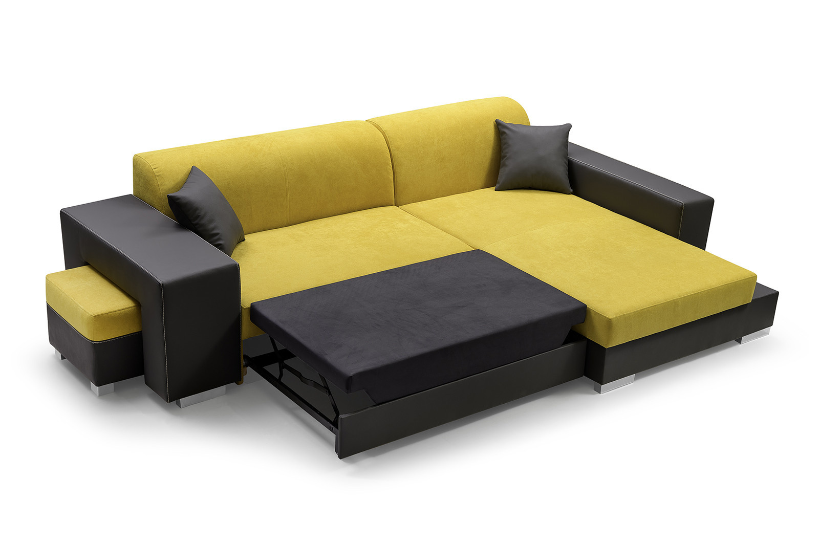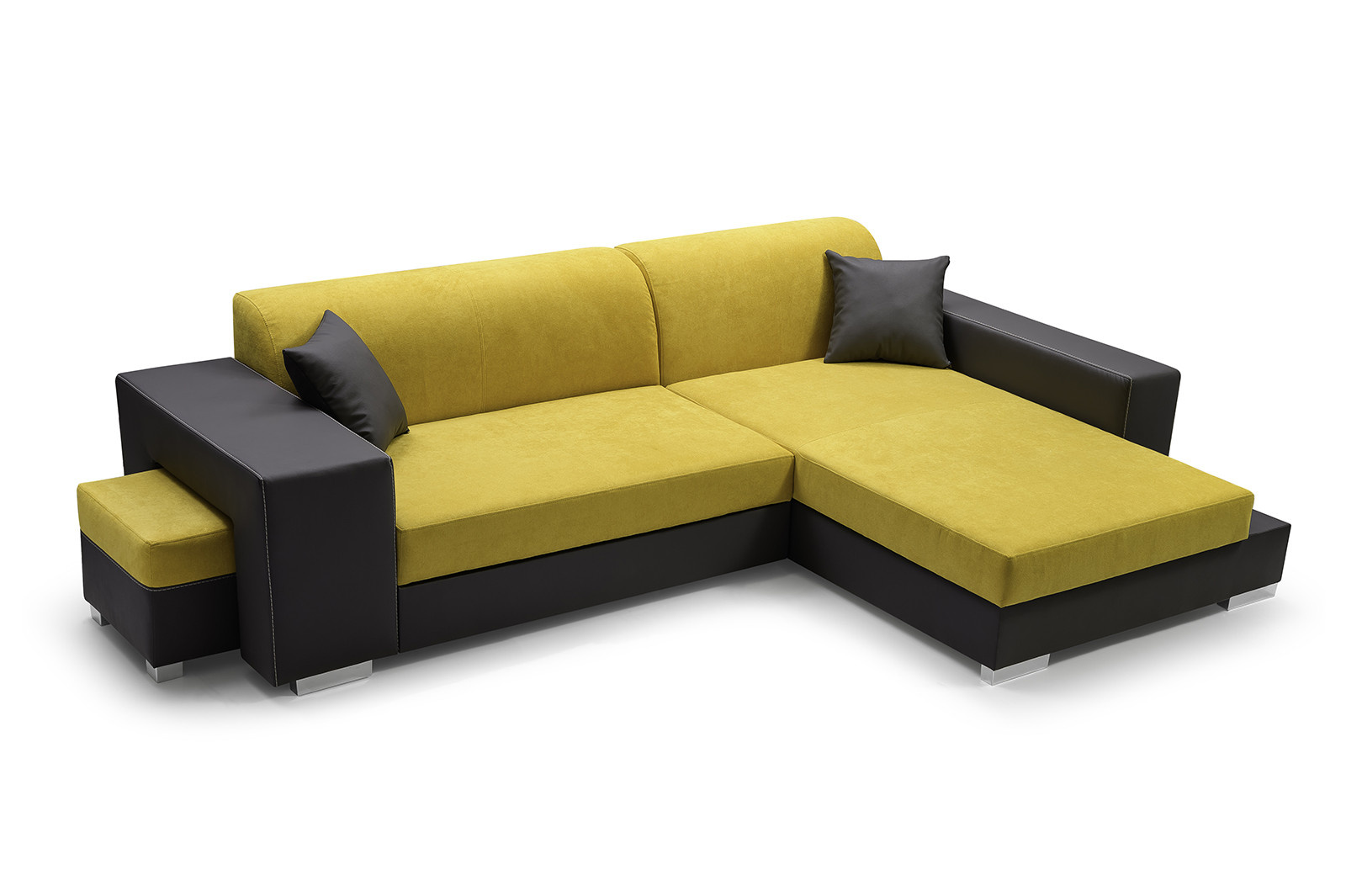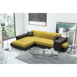 Rozkládací rohová pohovka MADAGASKAR je jednotka s funkcí spaní, praktická pro každodenní použití, která zaujme svým modernistickým designem - nikdo kolem tohoto modelu neprojde lhostejně. Stylová rohová sedací souprava je k dispozici v pravém i levém provedení. Nábytek stojí na chromovaných nohách, které dodávají konstrukci originální nádech. Model MADAGASKAR se dodává s taburetem, pro který je připraven speciální vestavěný úložný prostor. Taburet MADAGASKAR lze použít nejen jako samostatné místo k sezení, ale hodí se i jako podnožka - při sezení a čtení knihy nebo sledování televize si budete moci volně natáhnout nohy. Dodává se také s dekorativními polštářky, díky nimž nábytek získává na lehkosti. Moderní rohová sedací souprava s bočnicemi je v sedací části vyplněna vlnitou pružinou a čalounickou pěnou T-30 - díky těmto materiálům bude rohová sedací souprava kusem nábytku, na kterém se v důsledku každodenního používání neobjeví žádné nevzhledné deformace.