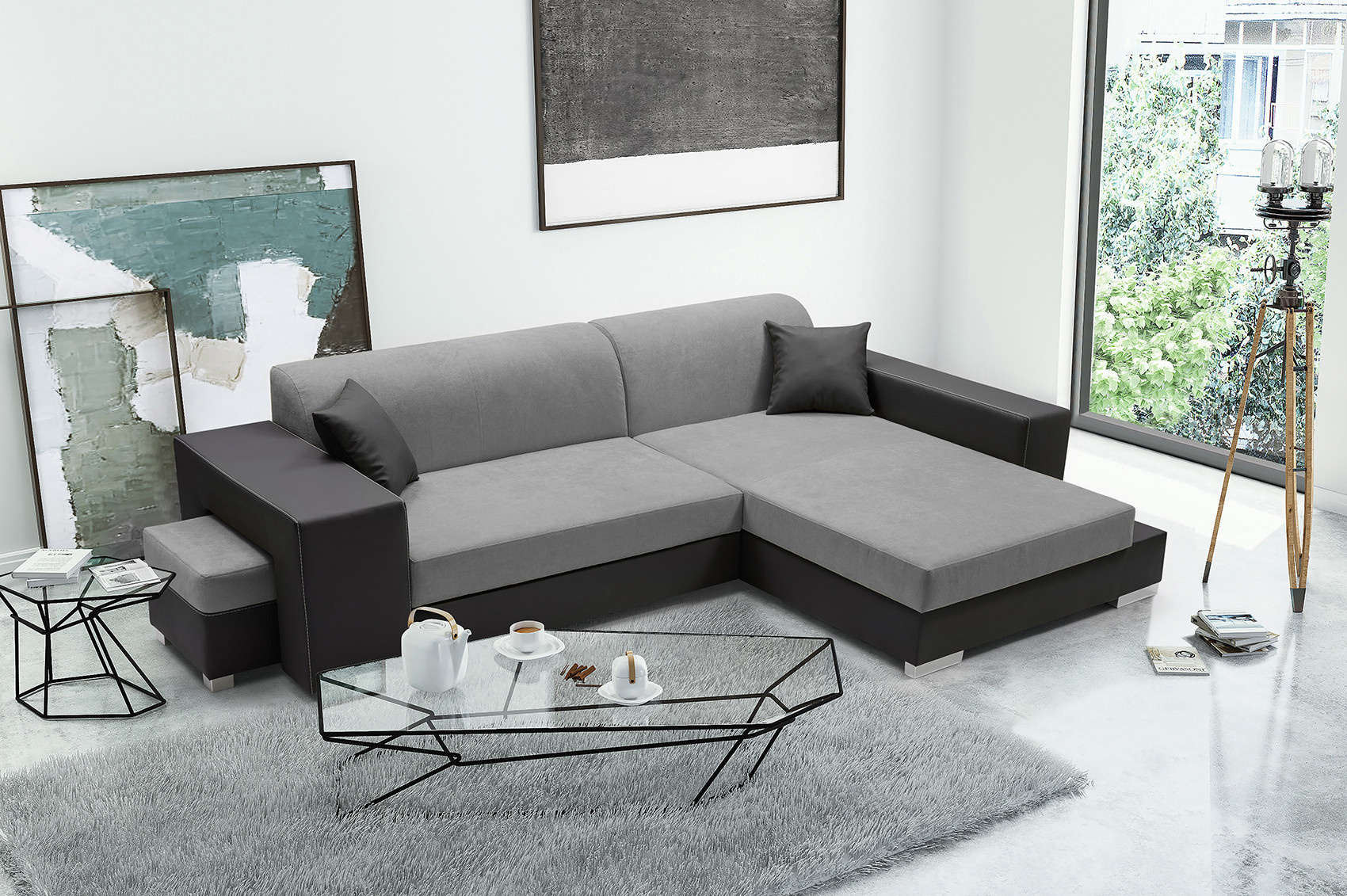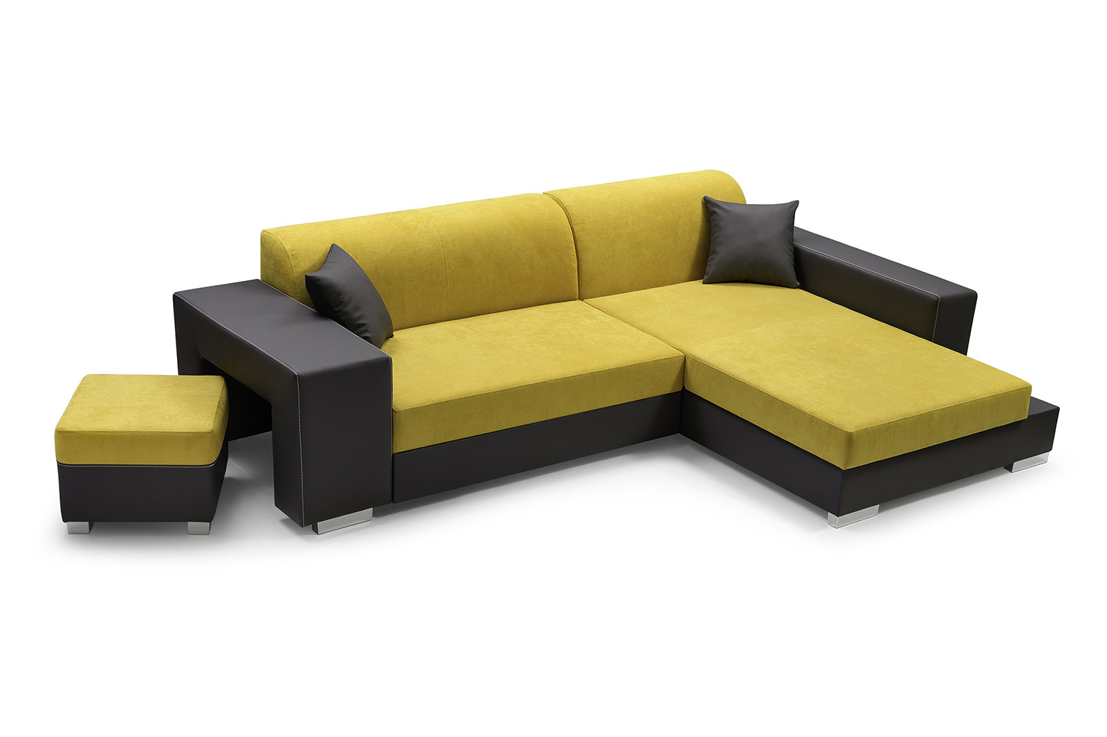 Rozkládací rohová pohovka MADAGASKAR je jednotka s funkcí spaní, praktická pro každodenní použití, která zaujme svým modernistickým designem - nikdo kolem tohoto modelu neprojde lhostejně. Stylová rohová sedací souprava je k dispozici v pravém i levém provedení. Nábytek stojí na chromovaných nohách, které dodávají konstrukci originální nádech. Model MADAGASKAR se dodává s taburetem, pro který je připraven speciální vestavěný úložný prostor. Taburet MADAGASKAR lze použít nejen jako samostatné místo k sezení, ale hodí se i jako podnožka - při sezení a čtení knihy nebo sledování televize si budete moci volně natáhnout nohy. Dodává se také s dekorativními polštářky, díky nimž nábytek získává na lehkosti. Moderní rohová sedací souprava s bočnicemi je v sedací části vyplněna vlnitou pružinou a čalounickou pěnou T-30 - díky těmto materiálům bude rohová sedací souprava kusem nábytku, na kterém se v důsledku každodenního používání neobjeví žádné nevzhledné deformace.