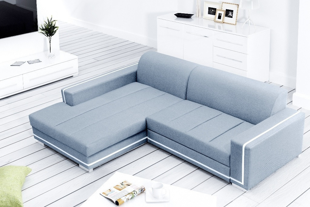 Rozkládací rohová pohovka MARITIN je moderní kus nábytku, který osloví milovníky modernistických řešení, kteří si cení vysoké estetiky a zvýšené funkčnosti. Rohová pohovka na dřevěném rámu a chromovaných nožkách bude vypadat skvěle jak u stěny, tak uprostřed místnosti, protože se jedná o kus nábytku s čalouněnými zády. Rohová sedací souprava MARITIN ve tvaru písmene L je pravostranný nebo levostranný kus nábytku, takže si ji každý může přizpůsobit individuálním preferencím. Moderní rohová sedací souprava je vybavena prostorným kontejnerem na lůžkoviny a funkcí spaní pro pohodlné ubytování hostů. Rohová sedací souprava s bočnicemi je čalouněna látkou, jejíž barvy lze vybrat ze vzorníku barev. Rohová sedací souprava ve tvaru písmene L je potažena čalounickou pěnou a vlnitou pružinou, která zvyšuje její pružnost, takže ani při každodenním používání nedochází k nevzhledným deformacím.