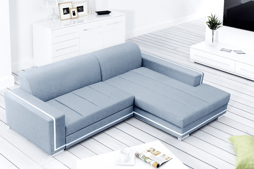 Rozkládací rohová pohovka MARITIN je moderní kus nábytku, který osloví milovníky modernistických řešení, kteří si cení vysoké estetiky a zvýšené funkčnosti. Rohová pohovka na dřevěném rámu a chromovaných nožkách bude vypadat skvěle jak u stěny, tak uprostřed místnosti, protože se jedná o kus nábytku s čalouněnými zády. Rohová sedací souprava MARITIN ve tvaru písmene L je pravostranný nebo levostranný kus nábytku, takže si ji každý může přizpůsobit individuálním preferencím. Moderní rohová sedací souprava je vybavena prostorným kontejnerem na lůžkoviny a funkcí spaní pro pohodlné ubytování hostů. Rohová sedací souprava s bočnicemi je čalouněna látkou, jejíž barvy lze vybrat ze vzorníku barev. Rohová sedací souprava ve tvaru písmene L je potažena čalounickou pěnou a vlnitou pružinou, která zvyšuje její pružnost, takže ani při každodenním používání nedochází k nevzhledným deformacím.