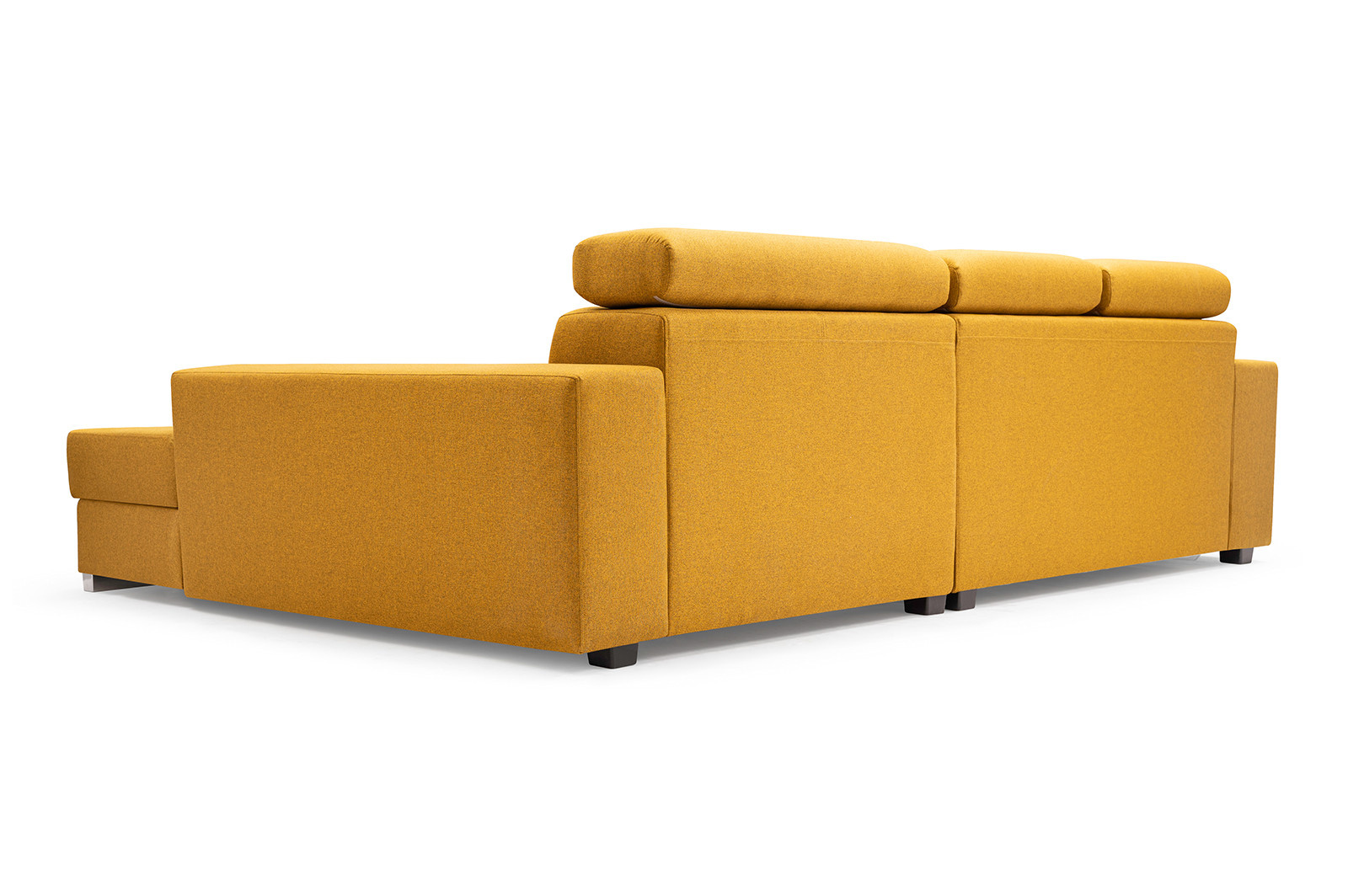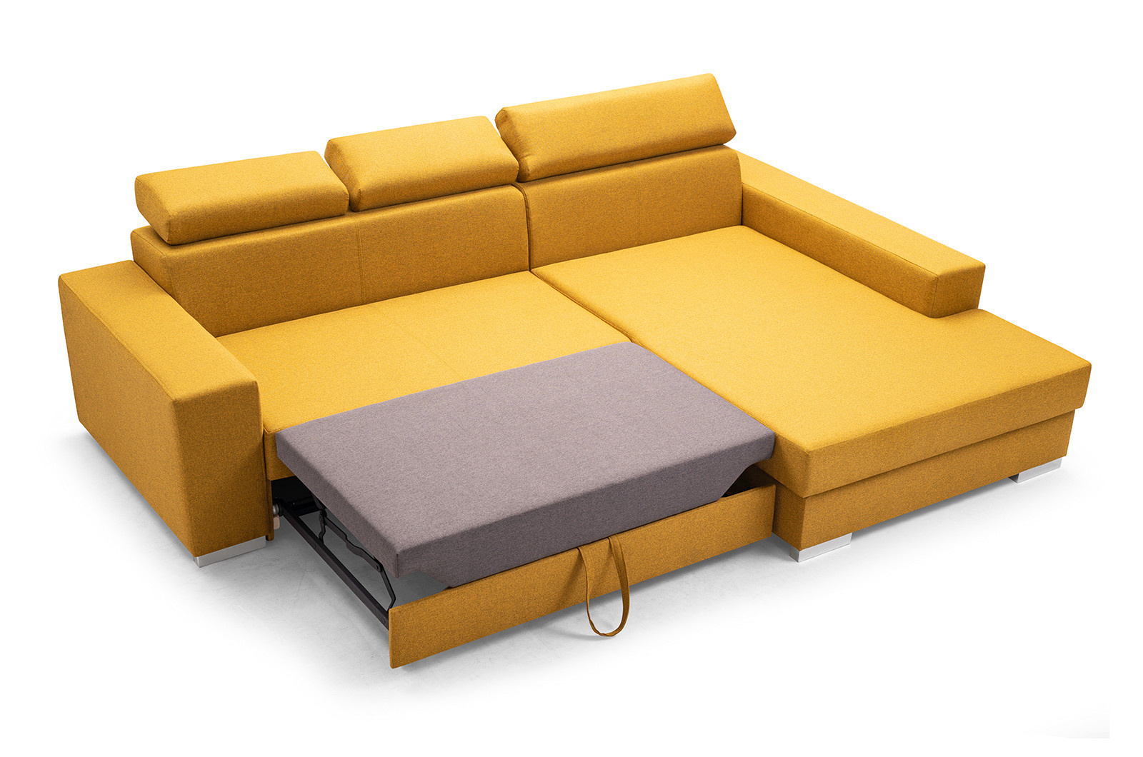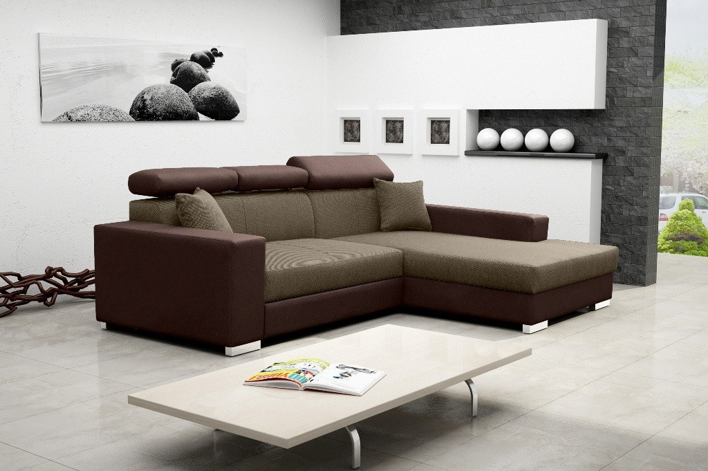 Sedací souprava MEXICO má moderní design, který se skvěle hodí do prostoru minimalistického nebo skandinávského obývacího pokoje. Stylová rohová sedací souprava je rozkládací kus nábytku, který je k dispozici v pravém nebo levém provedení. Rohová sedací souprava MEXICO ve tvaru písmene L má prostornou nádobu na lůžkoviny a je vybavena také funkcí spaní, takže ji lze rozložit. Rohová pohovka pro tři osoby je umístěna na dřevěném rámu a chromovaných nožkách, díky čemuž bude nejen stabilním a odolným kusem nábytku, ale také mimořádně estetickým a originálním. Nábytek je vyplněn vlnitými pružinami a čalounickou pěnou, tedy materiály, které se postarají o správnou pružnost - díky nim se na rohové pohovce ani přes neustálé používání neobjeví nevzhledné otlaky. Rohová sedací souprava MEXICO s bočnicemi je kus nábytku, který může být potažen látkou, koženkou .