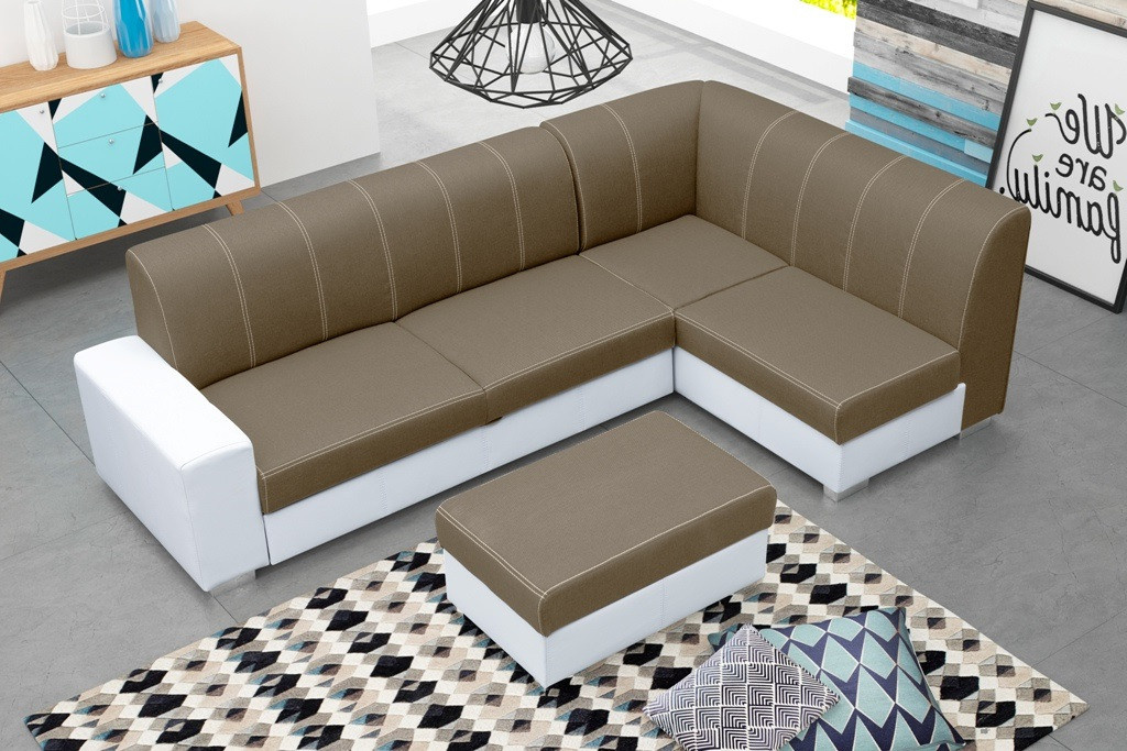 Elegantní rohová sedací souprava s taburetem se bude skvěle vyjímat v moderně zařízeném obývacím pokoji. Rohová pohovka s jednou stranou je k dispozici ve tvaru L, takže je možné zvolit pravostrannou nebo levostrannou verzi. Nábytek je umístěn na dřevěném rámu, který zajišťuje dostatečnou odolnost, pevnost a stabilitu konstrukce. Originální design nábytku doplňují chromované nohy. Barevné schéma lze vybrat z dostupných barevných vzorků. Rohová sedací souprava je vybavena prostorným kontejnerem na lůžkoviny a funkcí spaní, díky níž lze rohovou sedací soupravu rozložit. Rohová pohovka pro více osob je volně stojící kus nábytku - díky čalouněným zádům ji lze libovolně umístit do centrální části obývacího pokoje. Výplň rohové sedací soupravy tvoří vlnitá pružina a čalounická pěna; použité materiály zajišťují správnou pružnost, takže na rohové sedací soupravě nejsou vidět nevzhledné promáčkliny. Stylová rohová pohovka s ozdobným prošíváním na mírně tvarovaném opěradle zaručí nejen pohodlí při odpočinku, ale bude také ozdobou moderně zařízeného obývacího pokoje.