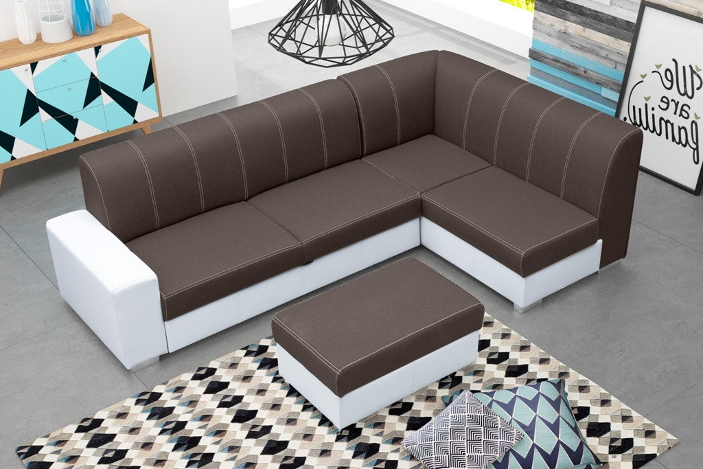 Elegantní rohová sedací souprava s taburetem se bude skvěle vyjímat v moderně zařízeném obývacím pokoji. Rohová pohovka s jednou stranou je k dispozici ve tvaru L, takže je možné zvolit pravostrannou nebo levostrannou verzi. Nábytek je umístěn na dřevěném rámu, který zajišťuje dostatečnou odolnost, pevnost a stabilitu konstrukce. Originální design nábytku doplňují chromované nohy. Barevné schéma lze vybrat z dostupných barevných vzorků. Rohová sedací souprava je vybavena prostorným kontejnerem na lůžkoviny a funkcí spaní, díky níž lze rohovou sedací soupravu rozložit. Rohová pohovka pro více osob je volně stojící kus nábytku - díky čalouněným zádům ji lze libovolně umístit do centrální části obývacího pokoje. Výplň rohové sedací soupravy tvoří vlnitá pružina a čalounická pěna; použité materiály zajišťují správnou pružnost, takže na rohové sedací soupravě nejsou vidět nevzhledné promáčkliny. Stylová rohová pohovka s ozdobným prošíváním na mírně tvarovaném opěradle zaručí nejen pohodlí při odpočinku, ale bude také ozdobou moderně zařízeného obývacího pokoje.