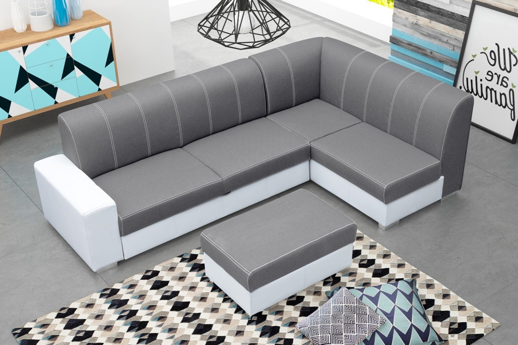 Elegantní rohová sedací souprava s taburetem se bude skvěle vyjímat v moderně zařízeném obývacím pokoji. Rohová pohovka s jednou stranou je k dispozici ve tvaru L, takže je možné zvolit pravostrannou nebo levostrannou verzi. Nábytek je umístěn na dřevěném rámu, který zajišťuje dostatečnou odolnost, pevnost a stabilitu konstrukce. Originální design nábytku doplňují chromované nohy. Barevné schéma lze vybrat z dostupných barevných vzorků. Rohová sedací souprava je vybavena prostorným kontejnerem na lůžkoviny a funkcí spaní, díky níž lze rohovou sedací soupravu rozložit. Rohová pohovka pro více osob je volně stojící kus nábytku - díky čalouněným zádům ji lze libovolně umístit do centrální části obývacího pokoje. Výplň rohové sedací soupravy tvoří vlnitá pružina a čalounická pěna; použité materiály zajišťují správnou pružnost, takže na rohové sedací soupravě nejsou vidět nevzhledné promáčkliny. Stylová rohová pohovka s ozdobným prošíváním na mírně tvarovaném opěradle zaručí nejen pohodlí při odpočinku, ale bude také ozdobou moderně zařízeného obývacího pokoje.