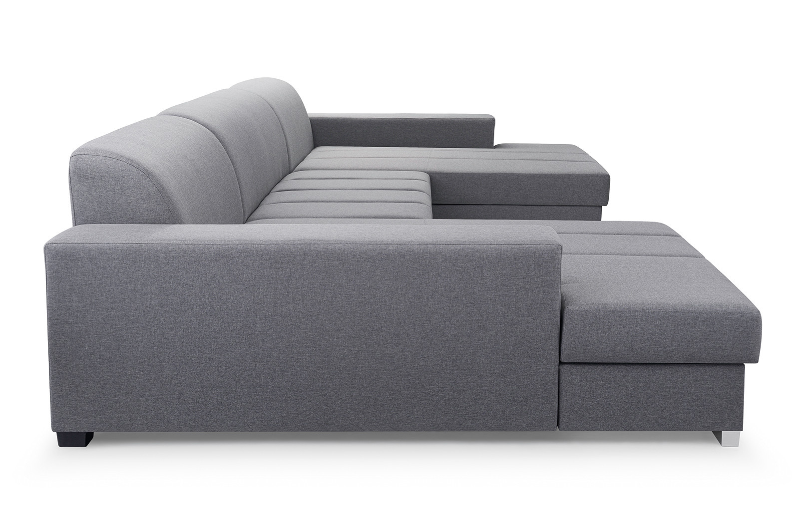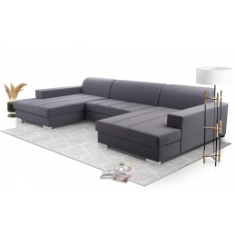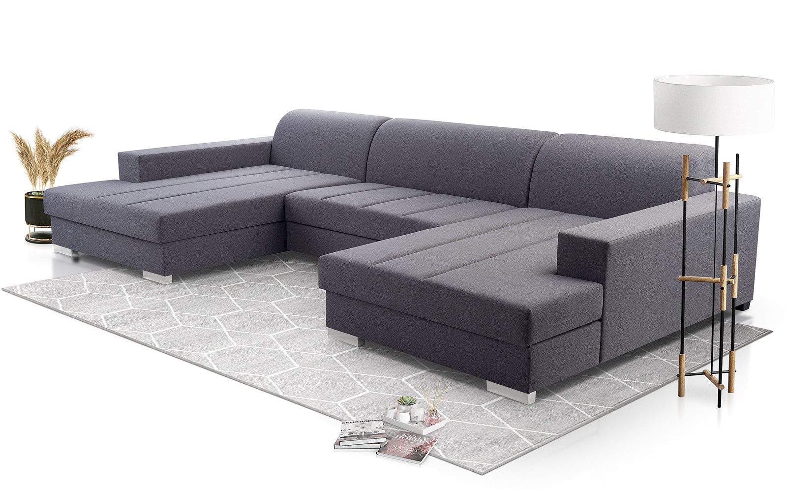 Rohová sedací souprava Mistral U je elegantní sedací souprava ve tvaru písmene U, která má poměrně univerzální tvar, takže ji lze bez větších problémů umístit ke stěně i doprostřed místnosti - jedná se o volně stojící kus nábytku s čalouněným opěradlem. Rozkládací rohová sedačka s rozkládáním, je vybavena 2 úložnými prostory a má funkci spaní. Stabilní a odolnou konstrukci tvoří dřevěný rám a prostor pod čalouněním je zakončen vlnitou pružinou a čalounickou pěnou, díky níž na nábytku nezůstanou nevzhledné otlaky ani deformace. Akcentem, který nábytku dodává originalitu a lehkost, jsou ozdobné stříbrné nohy. Rohová pohovka pro více osob je kus nábytku plně čalouněný kvalitní látkou, jejíž barevné provedení si můžete vybrat. Rohová sedací souprava AKITA U s bočnicemi v základním provedení . Sedací soupravu lze umístit doprostřed místnosti.