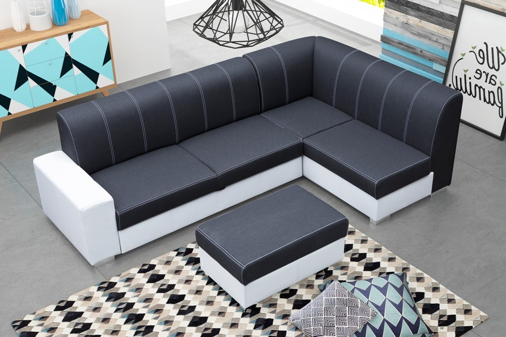 Elegantní rohová sedací souprava s taburetem se bude skvěle vyjímat v moderně zařízeném obývacím pokoji. Rohová pohovka s jednou stranou je k dispozici ve tvaru L, takže je možné zvolit pravostrannou nebo levostrannou verzi. Nábytek je umístěn na dřevěném rámu, který zajišťuje dostatečnou odolnost, pevnost a stabilitu konstrukce. Originální design nábytku doplňují chromované nohy. Barevné schéma lze vybrat z dostupných barevných vzorků. Rohová sedací souprava je vybavena prostorným kontejnerem na lůžkoviny a funkcí spaní, díky níž lze rohovou sedací soupravu rozložit. Rohová pohovka pro více osob je volně stojící kus nábytku - díky čalouněným zádům ji lze libovolně umístit do centrální části obývacího pokoje. Výplň rohové sedací soupravy tvoří vlnitá pružina a čalounická pěna; použité materiály zajišťují správnou pružnost, takže na rohové sedací soupravě nejsou vidět nevzhledné promáčkliny. Stylová rohová pohovka s ozdobným prošíváním na mírně tvarovaném opěradle zaručí nejen pohodlí při odpočinku, ale bude také ozdobou moderně zařízeného obývacího pokoje.
