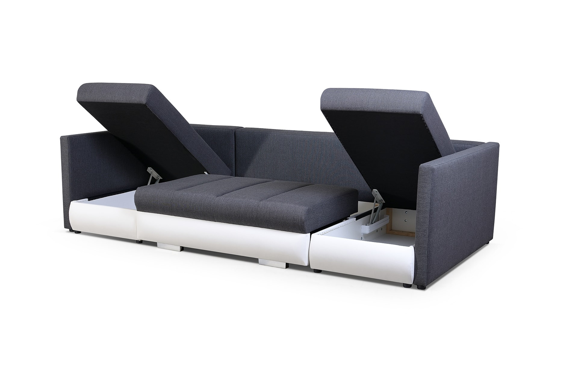 Rohová sedací souprava R-CITY U je elegantní sedací souprava ve tvaru písmene U, která má poměrně univerzální tvar, takže ji lze bez větších problémů umístit ke stěně i doprostřed místnosti - jedná se o volně stojící kus nábytku s čalouněným opěradlem. Rozkládací rohová sedačka s automatem MOS, který podporuje proces rozkládání, je vybavena třemi nádobami na lůžkoviny a má funkci spaní. Stabilní a odolnou konstrukci tvoří dřevěný rám a prostor pod čalouněním je zakončen vlnitou pružinou a čalounickou pěnou, díky níž na nábytku nezůstanou nevzhledné otlaky ani deformace. Akcentem, který nábytku dodává originalitu a lehkost, jsou ozdobné chromované nohy. Rohová pohovka pro více osob je kus nábytku plně čalouněný kvalitní látkou, jejíž barevné provedení si můžete vybrat. Rohová sedací souprava R-CITY U s bočnicemi v základním provedení je doplněna vložkami z ekokůže . Součástí dodávky jsou polštáře, které nábytku dodávají estetický nádech.
