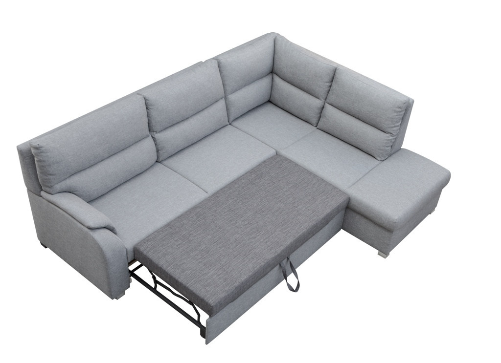 stylová rohová sedací souprava RAMIRO má tvar písmene L a je k dispozici v pravém nebo levém provedení. Rohová pohovka pro více osob je vybavena úložným prostorem na lůžkoviny a má také funkci spaní, která vám umožní pohodlně a bezpečně ubytovat pozvané hosty. Model RAMIRO může mít barevné provedení podle individuálního vkusu, které je k dispozici v bohaté paletě barev. Rohová pohovka stojí na dřevěném rámu s chromovanými nožkami. RAMIRO je volně stojící kus nábytku, takže má čalouněná záda, díky nimž jej lze umístit nejen ke stěně, ale i doprostřed místnosti. Výplň nábytku tvoří vlnitá pružina a čalounická pěna - právě tyto materiály jsou zodpovědné za zachování odpovídající pružnosti sedáku a opěráku.