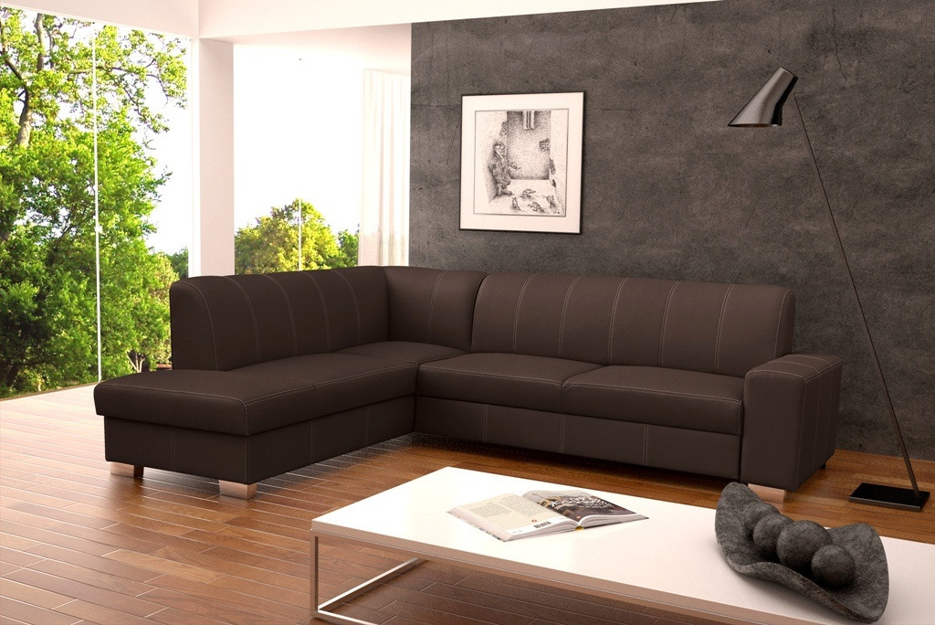 Rozkládací rohová pohovka SENATOR je moderní kus s jednou stranou, který se bude skvěle vyjímat v prostoru obývacího pokoje i soukromé pracovny. Rohová sedací souprava je čalouněná látkou. Rozkládací rohová pohovka je k dispozici v pravém nebo levém provedení, takže ji lze bez větších problémů plně přizpůsobit individuálním preferencím. Dřevěný rám rohové pohovky zaručuje odolnost a správnou stabilitu nábytku. Nábytek upoutá pozornost chromovanými nohami, které zdůrazňují moderní charakter konstrukce. Volně stojící rohová pohovka určená k samostatné montáži má funkci spaní, takže můžete pohodlně ubytovat své hosty, kteří si pohodlně a bezpečně odpočinou. Model SENATOR je na sedáku a profilovaném opěráku vyplněn vlnitou pružinou a čalounickou pěnou T-30, které zajišťují správnou pružnost - nábytek se nebude nevzhledně deformovat, a zachová si svůj estetický vzhled.