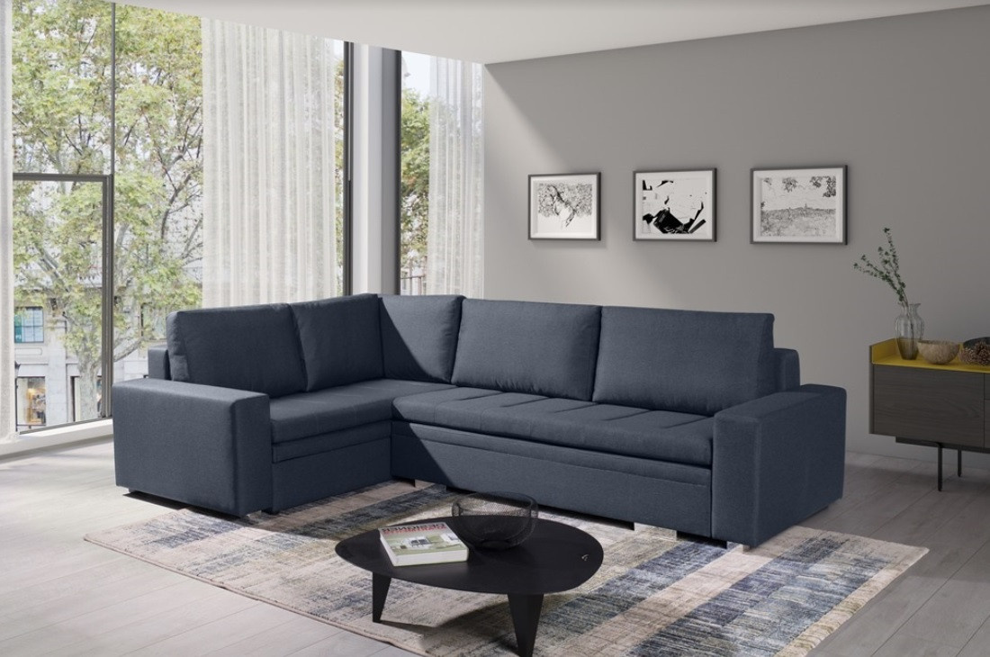 Moderní rohová sedací souprava TIA je určena pro více osob a je vybavena až dvěma kontejnery na lůžkoviny, do kterých můžete bez větších problémů uložit polštáře, přikrývky a peřiny. Rohová sedací souprava ve tvaru písmene L je k dispozici v pravém nebo levém provedení. Stylová rohová sedací souprava s funkcí spaní je navíc vybavena automatickým rozkladem, díky níž je možné nábytek rychle a efektivně rozložit. Rohová sedací souprava pro více osob s bočnicemi je vyplněna vlnitou pružinou na spací ploše, sedáku a opěráku a také čalounickou pěnou T-30. Volně stojící rohová sedací souprava je umístěna na ozdobných chromovaných nožkách, které podtrhují modernistické uspořádání nábytku. Odolný a stabilní kus nábytku s dřevěným rámem má čalouněná záda, díky nimž jej lze umístit nejen ke stěně, ale i do centrální části místnosti. Rozkládací rohovou pohovku TIA do obývacího pokoje lze čalounit různými látkami.