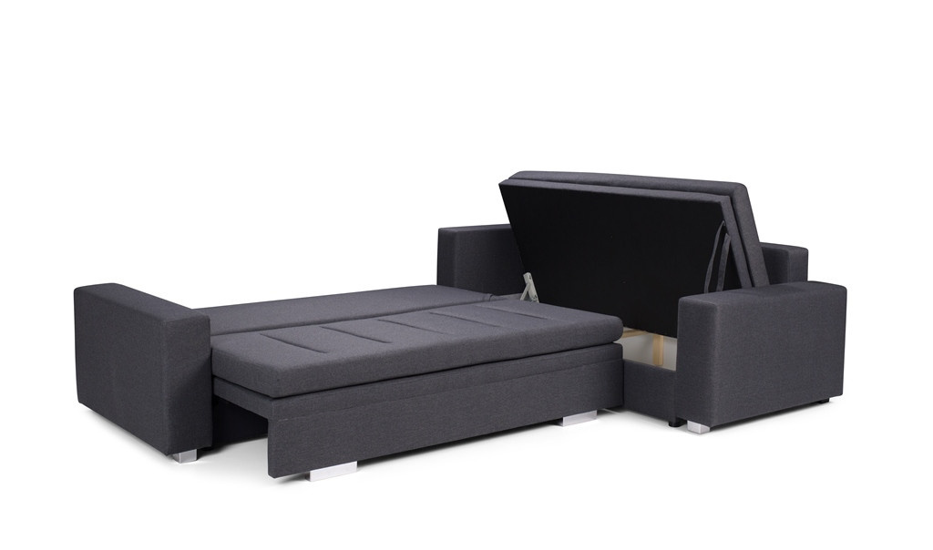 Moderní rohová sedací souprava TIA je určena pro více osob a je vybavena až dvěma kontejnery na lůžkoviny, do kterých můžete bez větších problémů uložit polštáře, přikrývky a peřiny. Rohová sedací souprava ve tvaru písmene L je k dispozici v pravém nebo levém provedení. Stylová rohová sedací souprava s funkcí spaní je navíc vybavena automatickým rozkladem, díky níž je možné nábytek rychle a efektivně rozložit. Rohová sedací souprava pro více osob s bočnicemi je vyplněna vlnitou pružinou na spací ploše, sedáku a opěráku a také čalounickou pěnou T-30. Volně stojící rohová sedací souprava je umístěna na ozdobných chromovaných nožkách, které podtrhují modernistické uspořádání nábytku. Odolný a stabilní kus nábytku s dřevěným rámem má čalouněná záda, díky nimž jej lze umístit nejen ke stěně, ale i do centrální části místnosti. Rozkládací rohovou pohovku TIA do obývacího pokoje lze čalounit různými látkami.