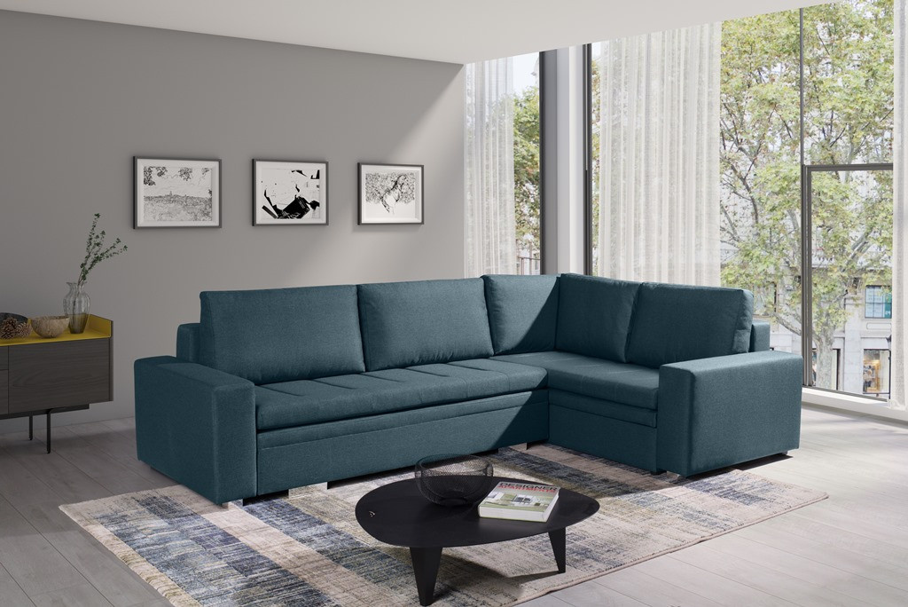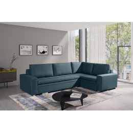 Moderní rohová sedací souprava TIA je určena pro více osob a je vybavena až dvěma kontejnery na lůžkoviny, do kterých můžete bez větších problémů uložit polštáře, přikrývky a peřiny. Rohová sedací souprava ve tvaru písmene L je k dispozici v pravém nebo levém provedení. Stylová rohová sedací souprava s funkcí spaní je navíc vybavena automatickým rozkladem, díky níž je možné nábytek rychle a efektivně rozložit. Rohová sedací souprava pro více osob s bočnicemi je vyplněna vlnitou pružinou na spací ploše, sedáku a opěráku a také čalounickou pěnou T-30. Volně stojící rohová sedací souprava je umístěna na ozdobných chromovaných nožkách, které podtrhují modernistické uspořádání nábytku. Odolný a stabilní kus nábytku s dřevěným rámem má čalouněná záda, díky nimž jej lze umístit nejen ke stěně, ale i do centrální části místnosti. Rozkládací rohovou pohovku TIA do obývacího pokoje lze čalounit různými látkami.
