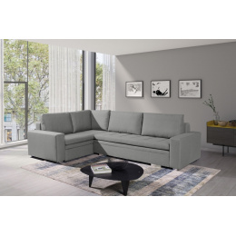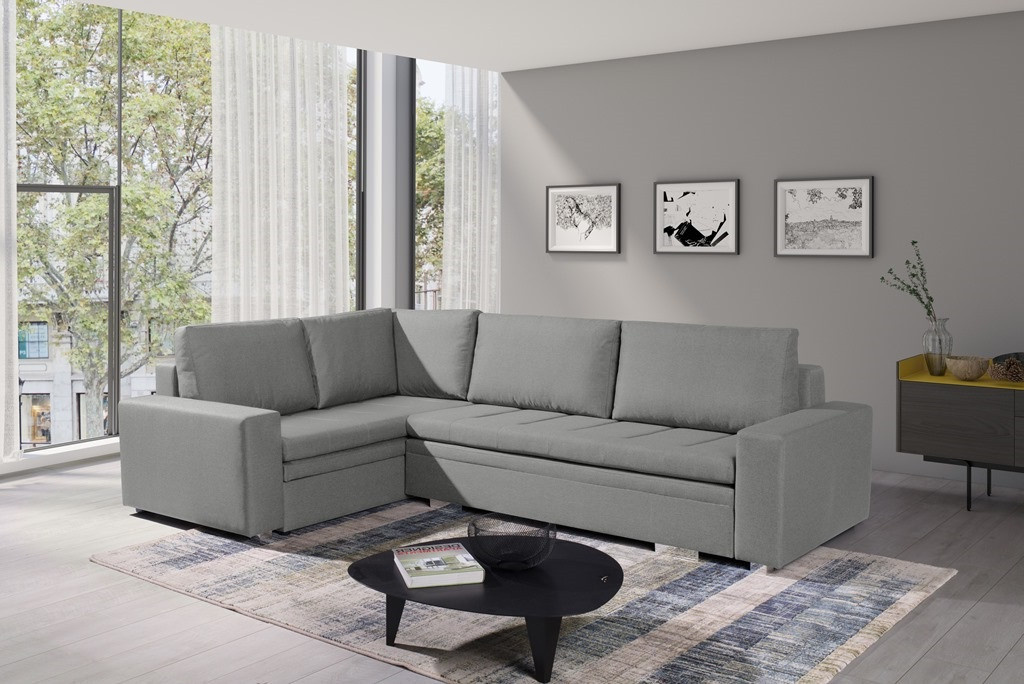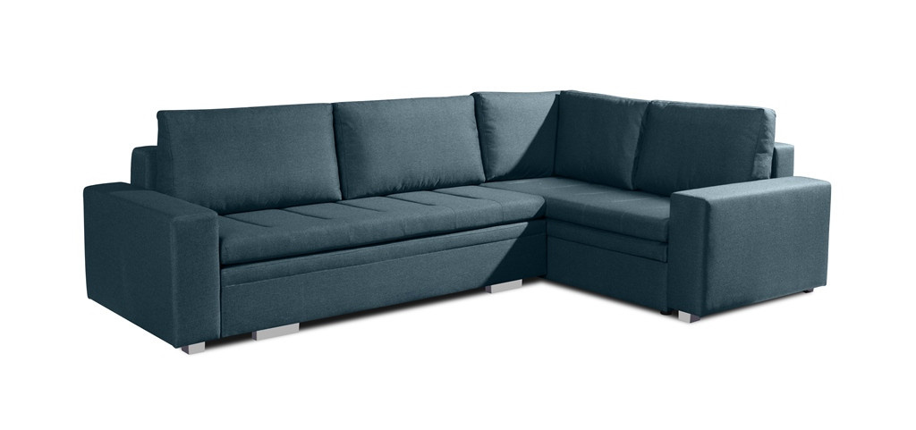 Moderní rohová sedací souprava TIA je určena pro více osob a je vybavena až dvěma kontejnery na lůžkoviny, do kterých můžete bez větších problémů uložit polštáře, přikrývky a peřiny. Rohová sedací souprava ve tvaru písmene L je k dispozici v pravém nebo levém provedení. Stylová rohová sedací souprava s funkcí spaní je navíc vybavena automatickým rozkladem, díky níž je možné nábytek rychle a efektivně rozložit. Rohová sedací souprava pro více osob s bočnicemi je vyplněna vlnitou pružinou na spací ploše, sedáku a opěráku a také čalounickou pěnou T-30. Volně stojící rohová sedací souprava je umístěna na ozdobných chromovaných nožkách, které podtrhují modernistické uspořádání nábytku. Odolný a stabilní kus nábytku s dřevěným rámem má čalouněná záda, díky nimž jej lze umístit nejen ke stěně, ale i do centrální části místnosti. Rozkládací rohovou pohovku TIA do obývacího pokoje lze čalounit různými látkami.