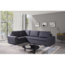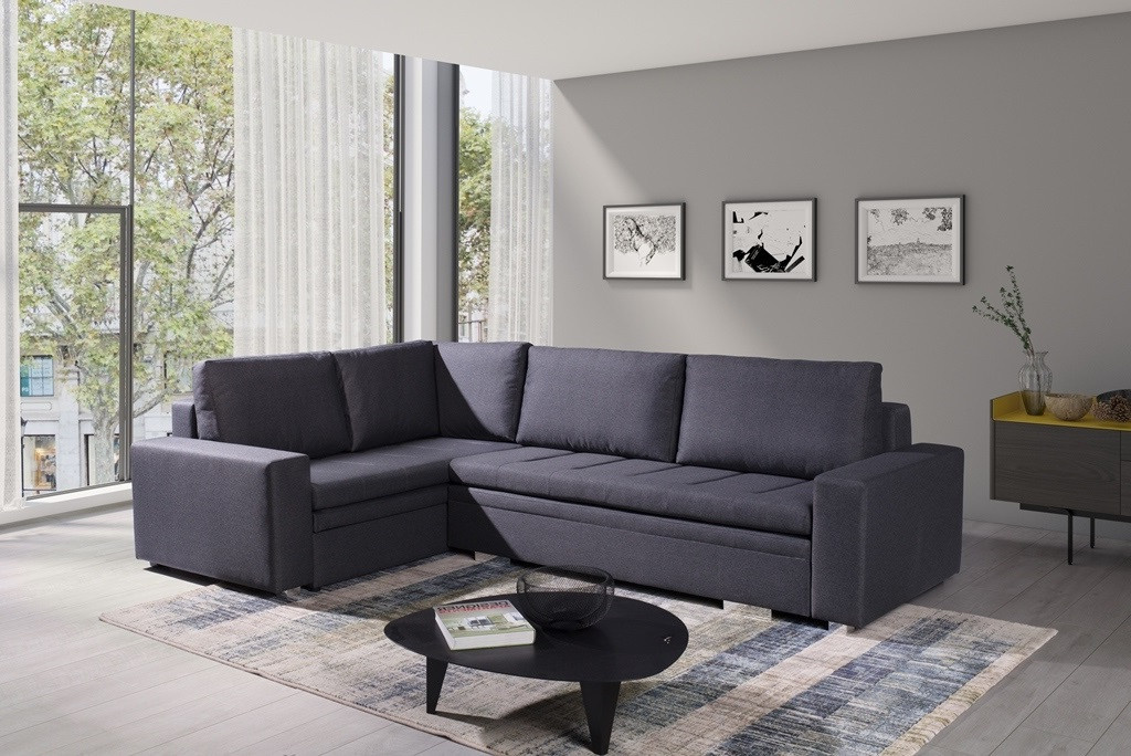 Moderní rohová sedací souprava TIA je určena pro více osob a je vybavena až dvěma kontejnery na lůžkoviny, do kterých můžete bez větších problémů uložit polštáře, přikrývky a peřiny. Rohová sedací souprava ve tvaru písmene L je k dispozici v pravém nebo levém provedení. Stylová rohová sedací souprava s funkcí spaní je navíc vybavena automatickým rozkladem, díky níž je možné nábytek rychle a efektivně rozložit. Rohová sedací souprava pro více osob s bočnicemi je vyplněna vlnitou pružinou na spací ploše, sedáku a opěráku a také čalounickou pěnou T-30. Volně stojící rohová sedací souprava je umístěna na ozdobných chromovaných nožkách, které podtrhují modernistické uspořádání nábytku. Odolný a stabilní kus nábytku s dřevěným rámem má čalouněná záda, díky nimž jej lze umístit nejen ke stěně, ale i do centrální části místnosti. Rozkládací rohovou pohovku TIA do obývacího pokoje lze čalounit různými látkami.