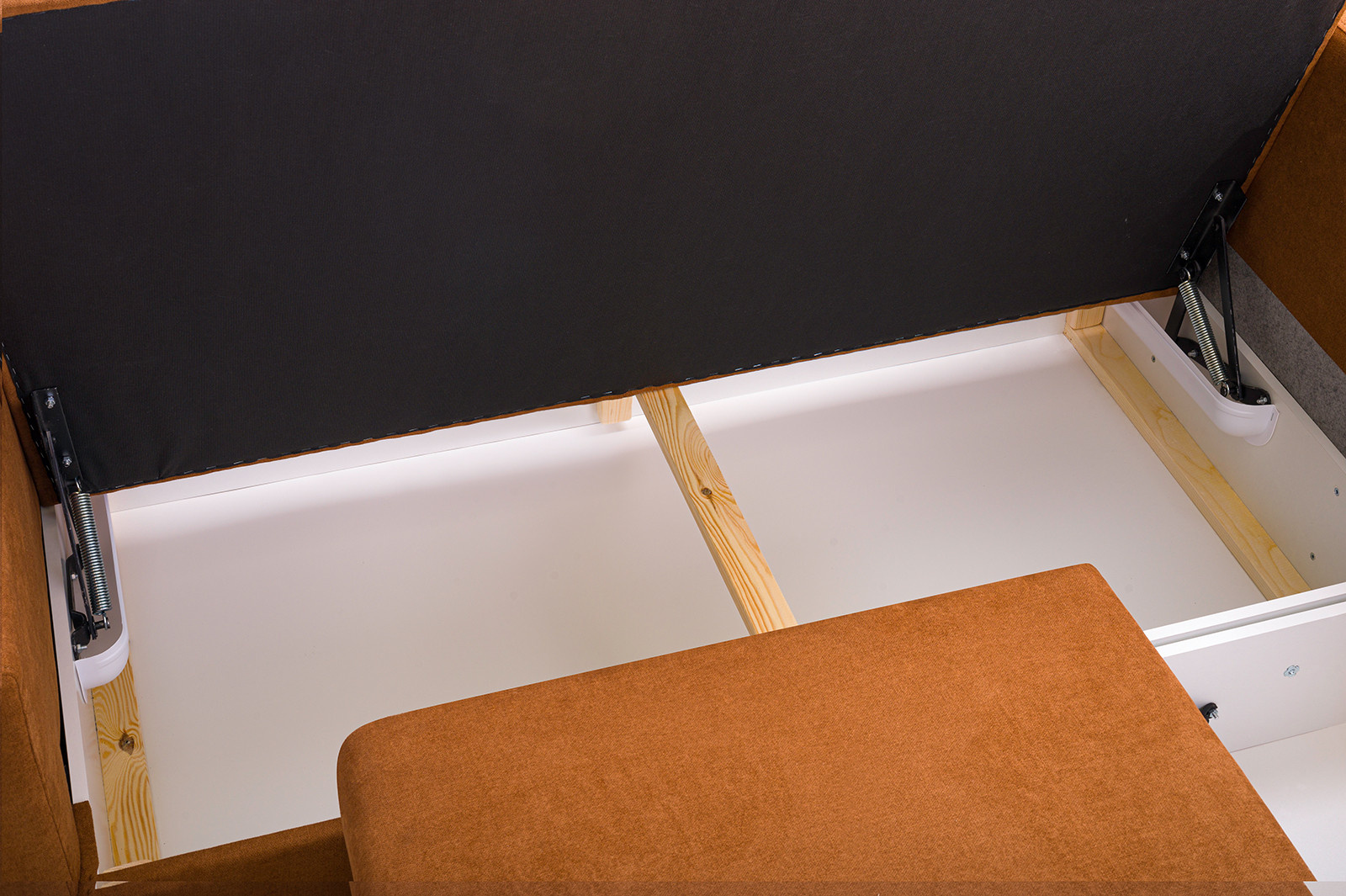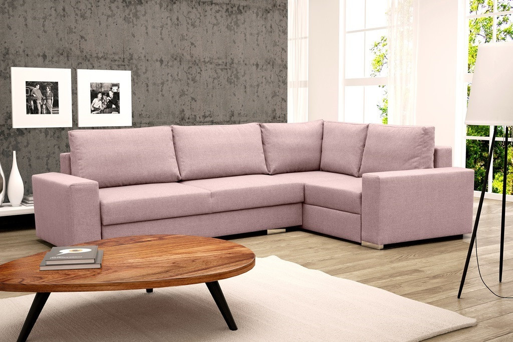 Rozkládací rohová pohovka TORNADO je prostorný volně stojící kus nábytku, který je k dispozici v pravém nebo levém provedení. Představená rohová sedací souprava s bočnicemi ve tvaru písmene L je vybavena dekorativními polštáři, které lze umístit na opěradlo nábytku. Moderní rohová sedací souprava do obývacího pokoje je nábytek pro více osob, který zaujme estetickým designem a doplňkovými chromovanými nožkami. Rohová pohovka je praktická při každodenním používání a zaručuje pohodlí a komfort i při několikahodinovém sezení nebo odpoledním spánku. Rohová pohovka je vybavena automatickým rozkládáním, díky němuž ji lze efektivně přeměnit na lůžko. Nábytek s dřevěným rámem má dva úložné prostory na lůžkoviny, do kterých můžete snadno uložit peřiny, polštáře a přikrývky, ale i předměty denní potřeby, které se nevejdou do skříně. Model TORNADO je rohová sedací souprava, která je vyplněna vlnitými pružinami a čalounickou pěnou - ani její časté používání neovlivní pružnost sedáku nebo opěráku. Rohová sedací souprava s funkcí spaní je čalouněná látkou, jejíž barvy si můžete vybrat z dostupných barevných vzorků.
