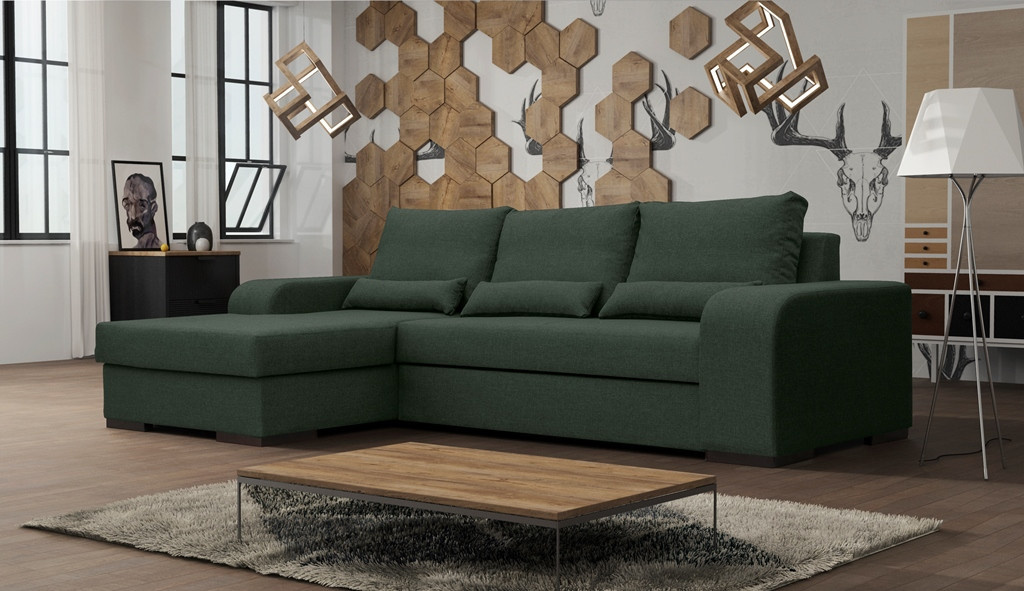 Tvarovaná rohová pohovka VIRAGO s bočnicemi najde své ideální místo v obývacím pokoji. Rohová sedací souprava je pohodlná pro každodenní používání a její součástí jsou dekorativní polštáře, které zajišťují maximální pohodlí při sezení. Rohová sedací souprava ve tvaru písmene L je k dispozici v pravostranném nebo levostranném provedení, takže si ji každý může přizpůsobit uspořádání místnosti. Rohová sedací souprava je vybavena funkcí spaní, díky níž je možné ji rozložit. Rohová pohovka pro více osob má také prostorný úložný prostor na lůžkoviny pro uložení přikrývek, peřin a polštářů. Nábytek s dřevěným rámem stojí na dřevěných nohách v barvě tmavého ořechu. Volně stojící rohová sedací souprava je vyplněna vlnitými pružinami a čalounickou pěnou, díky čemuž si rohová sedací souprava zachová správnou pružnost a nevzniknou na ní nevzhledné deformace ani promáčkliny. Model VIRAGO je čalouněný látkou, jejíž barvy si lze vybrat podle individuálních preferencí z bohatého vzorníku.