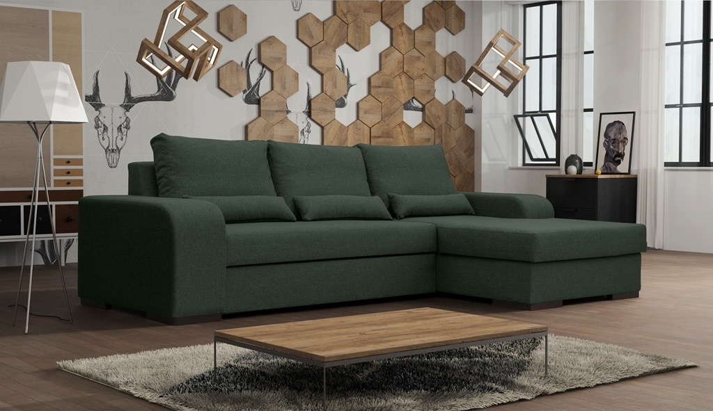 Tvarovaná rohová pohovka VIRAGO s bočnicemi najde své ideální místo v obývacím pokoji. Rohová sedací souprava je pohodlná pro každodenní používání a její součástí jsou dekorativní polštáře, které zajišťují maximální pohodlí při sezení. Rohová sedací souprava ve tvaru písmene L je k dispozici v pravostranném nebo levostranném provedení, takže si ji každý může přizpůsobit uspořádání místnosti. Rohová sedací souprava je vybavena funkcí spaní, díky níž je možné ji rozložit. Rohová pohovka pro více osob má také prostorný úložný prostor na lůžkoviny pro uložení přikrývek, peřin a polštářů. Nábytek s dřevěným rámem stojí na dřevěných nohách v barvě tmavého ořechu. Volně stojící rohová sedací souprava je vyplněna vlnitými pružinami a čalounickou pěnou, díky čemuž si rohová sedací souprava zachová správnou pružnost a nevzniknou na ní nevzhledné deformace ani promáčkliny. Model VIRAGO je čalouněný látkou, jejíž barvy si lze vybrat podle individuálních preferencí z bohatého vzorníku.