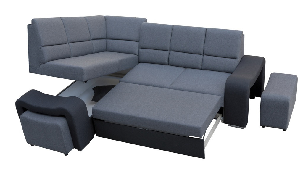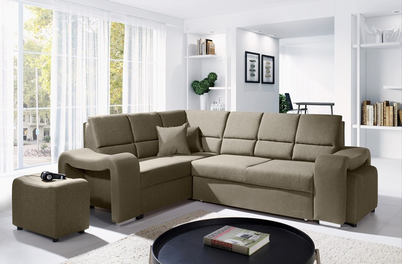 Rohová sedací souprava WAKIKI má stylový design, který zajistí pohodlí i při mnohahodinovém odpočinku s rodinou nebo přáteli. Tato moderní rohová pohovka ve tvaru písmene L je k dispozici v pravém i levém provedení. Představená rohová sedací souprava pro více osob s funkcí spaní umožňuje rozložit nábytek, což zajistí pohodlí a bezpečnost spánku. WAKIKI je k dispozici v široké škále barev, takže si každý může vytvořit model podle svého individuálního vkusu a preferencí. Moderní rohová pohovka do obývacího pokoje je doplněna dvěma taburety, které vytvářejí další sedací plochu a hodí se i jako podnožka. Do nábytku byly zabudovány speciální úložné prostory pro výše zmíněné taburety, do kterých je bude možné volně uložit, když se nebudou používat. Nábytek stojí na dřevěném rámu s chromovanými nohami, které mu dodávají moderní vzhled. Volně stojící rohová sedací souprava WAKIKI má také úložný prostor na lůžkoviny, do kterého lze bez větších problémů uložit přikrývky, polštáře nebo deky.