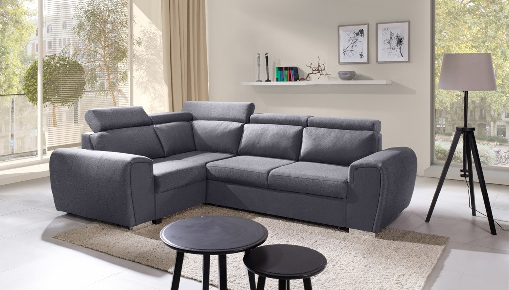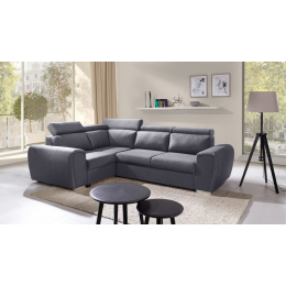 Moderní rohová sedací souprava WIZARO má elegantní design, který dokonale zapadne do prostoru obývacího pokoje nebo obývacího pokoje zařízeného v industriální a modernistické estetice. Rohová sedací souprava ve tvaru písmene L s bočnicemi je k dispozici ve dvou variantách: pravé nebo levé. Rohová sedací souprava s mírně zaoblenými hranami je vybavena pohyblivými opěrkami hlavy, díky nimž si každý může nastavit opěradlo podle svých individuálních potřeb a vlastního pohodlí. Rohová souprava pro více osob se dodává s dekorativními polštáři. Kromě polohovatelného opěradla má rohová pohovka úložný prostor na lůžkoviny a také funkci spaní, takže ji lze rozložit a zajistit tak pozvaným hostům pohodlí a bezpečný noční odpočinek. Rohová pohovka s dřevěným rámem je vyplněna čalounickou pěnou T-30 a vlnitou pružinou na sedací části. Výše uvedené materiály zajistí trvanlivost, stabilitu a pevnost konstrukce. Stylová rohová pohovka s chromovanými nožkami bude nejen místem pohodlného odpočinku, ale také estetickým kusem nábytku podtrhujícím vytvořené uspořádání.