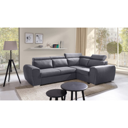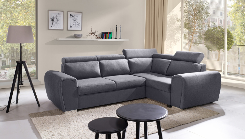 Moderní rohová sedací souprava WIZARO má elegantní design, který dokonale zapadne do prostoru obývacího pokoje nebo obývacího pokoje zařízeného v industriální a modernistické estetice. Rohová sedací souprava ve tvaru písmene L s bočnicemi je k dispozici ve dvou variantách: pravé nebo levé. Rohová sedací souprava s mírně zaoblenými hranami je vybavena pohyblivými opěrkami hlavy, díky nimž si každý může nastavit opěradlo podle svých individuálních potřeb a vlastního pohodlí. Rohová souprava pro více osob se dodává s dekorativními polštáři. Kromě polohovatelného opěradla má rohová pohovka úložný prostor na lůžkoviny a také funkci spaní, takže ji lze rozložit a zajistit tak pozvaným hostům pohodlí a bezpečný noční odpočinek. Rohová pohovka s dřevěným rámem je vyplněna čalounickou pěnou T-30 a vlnitou pružinou na sedací části. Výše uvedené materiály zajistí trvanlivost, stabilitu a pevnost konstrukce. Stylová rohová pohovka s chromovanými nožkami bude nejen místem pohodlného odpočinku, ale také estetickým kusem nábytku podtrhujícím vytvořené uspořádání.