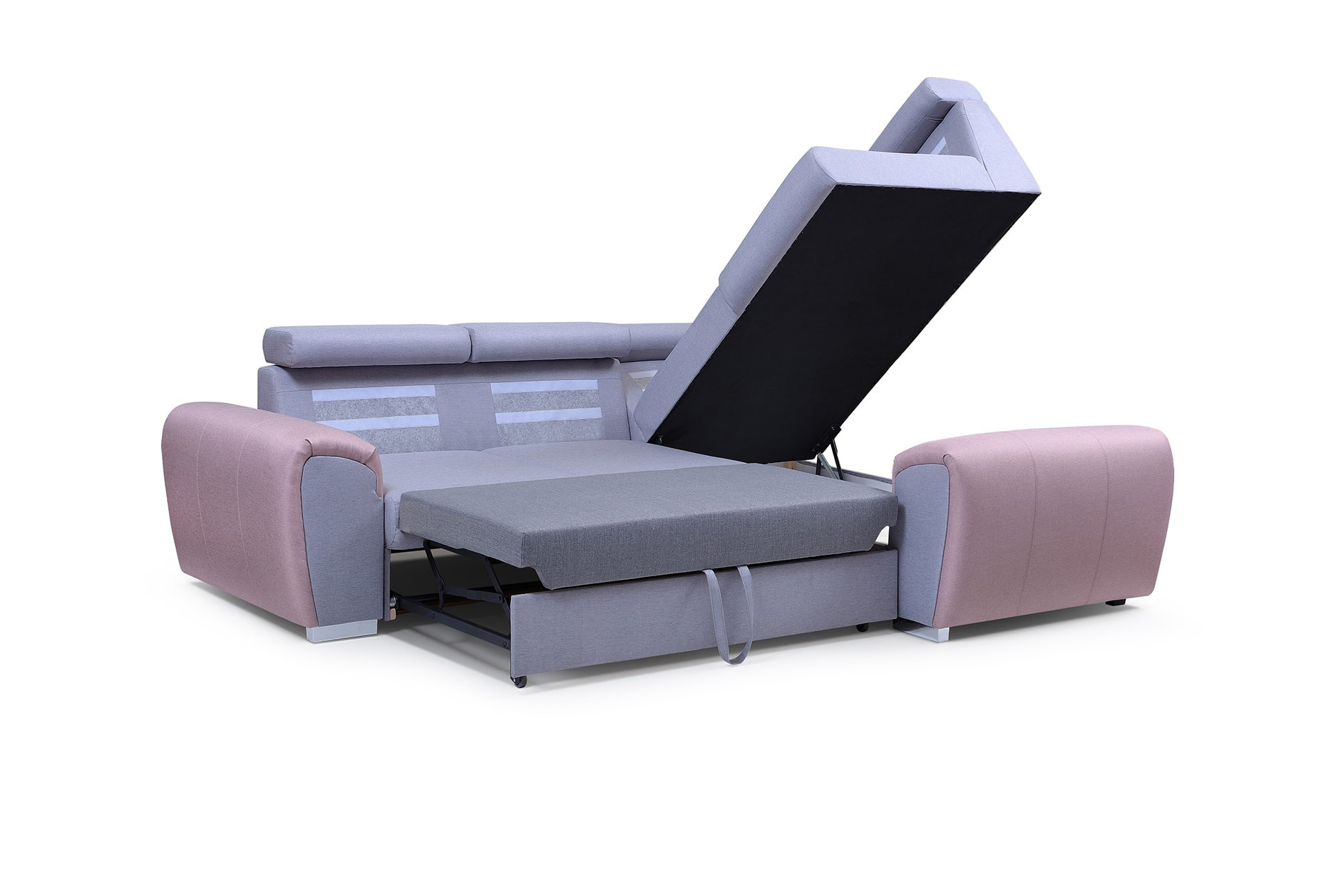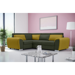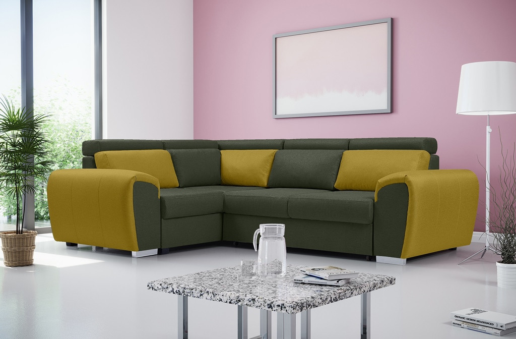 Dvoubarevná rohová sedací souprava WYZ je vysoce estetický design s jemně zaoblenými tvary, který se bude skvěle hodit do prostoru obývacího pokoje nebo moderně zařízeného obývacího pokoje. Rozkládací rohová sedací souprava s bočnicemi stojí na chromových nožkách, které nejenže dodávají nábytku stylový charakter, ale také zajišťují odpovídající stabilitu a odolnost. Rohová sedací souprava WYZ ve tvaru písmene L je k dispozici v pravém nebo levém provedení. Rohová sedací souprava s bočnicemi je vybavena nádobou na lůžkoviny, funkcí spaní a automatickým rozkládáním typu delfín. Rohová pohovka je čalouněná látkou a je k dispozici v široké škále barev, aby vyhovovala individuálním preferencím každého z vás. Představený model WYZ je vybaven nastavitelnými opěrkami hlavy a dekorativními polštáři, které zajistí pohodlí i při několikahodinovém sezení s knihou v ruce nebo při sledování televize. Dřevěný rám je vyplněn vlnitými pružinami a čalounickou pěnou, které se starají o zachování zvýšené pružnosti, takže na nábytku nevznikají nevzhledné deformace. Moderní rohová sedací souprava se vyrábí na objednávku, takže je možné zvolit barvu vložek a celkové barevné provedení.