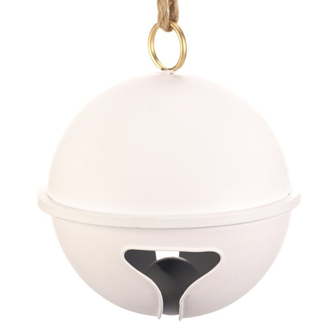 Závěsná kovová rolnička v bílé barvě zaujme už na první pohled. Má totiž obří průměr 26 cm. Visí na provázku a nejlépe vynikne jako solitérní ozdoba na stěně nebo okně, případně může být použita na vzrostlý, venkovní strom. Na klasický vánoční stromeček se nehodí, neboť její váha by mohla polámat drobné větvičky. Ideální je pro ty, kteří chtějí dodat svátečnímu prostoru dominantní prvek.