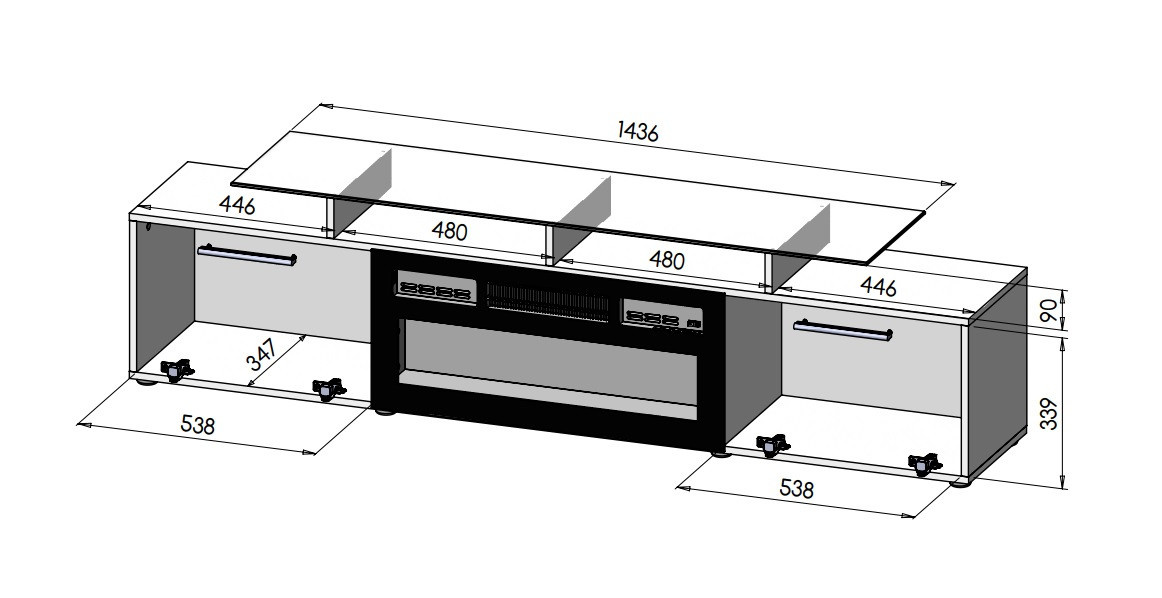 RTV KABINET (možnost instalace krbu, nutno objednat zvlášť, CAMA-KOMINEK...) Rozměry: š/s/g- 48/190/37 cm Kostra: 16 mm laminovaná dřevotřísková deska, splňuje požadavky CARB Přední strana: 16 mm lesklá MDF deska, splňuje požadavky CARB Nožičky: plast Rukojeti: plast Sklo: 8 mm tvrzené sklo, frézované-trapézové Rozměry: 202x43x12 Hmotnost: 42 kg