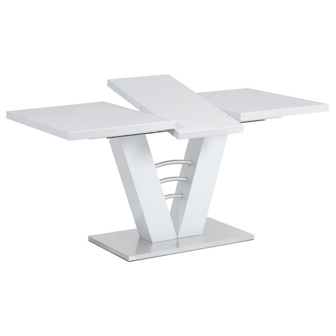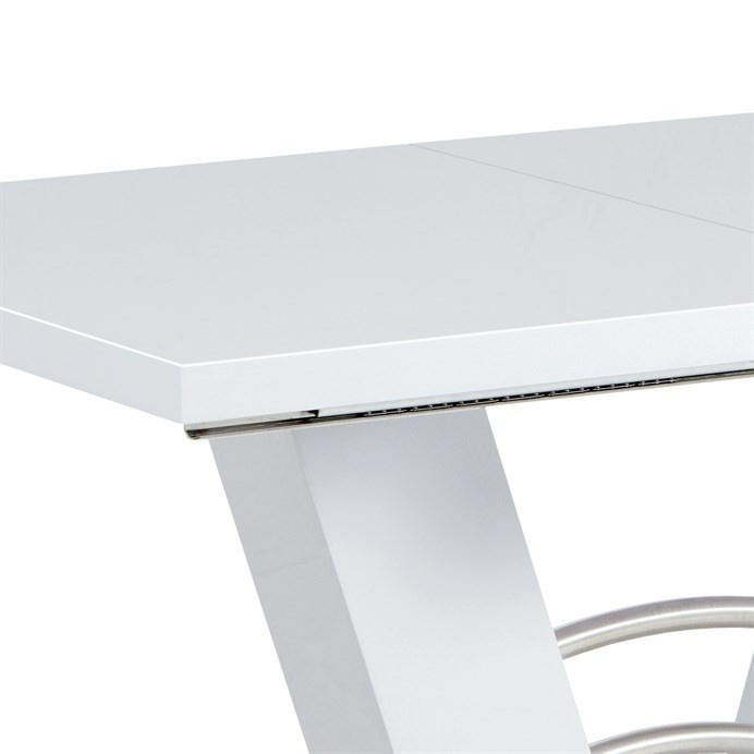 Rozkládací jídelní stůl o rozměrech 120+40x80 cm v bílém lesklém provedení nabízí moderní design a praktickou funkci rozkladu. Deska stolu je vyrobena z MDF s lesklou povrchovou úpravou, která zajišťuje snadnou údržbu a odolnost proti poškrábání. Stabilní nohy jsou rovněž z MDF a doplněné o dekorativní prvky z broušeného nerezu, které podtrhují současný vzhled stolu. Mechanismus rozkladu umožňuje jednoduché a plynulé zvětšení pracovní plochy o 40 cm, což oceníte při větších rodinných setkáních nebo návštěvách. Pevná konstrukce a kvalitní materiály zaručují stabilitu a dlouhou životnost nábytku.
