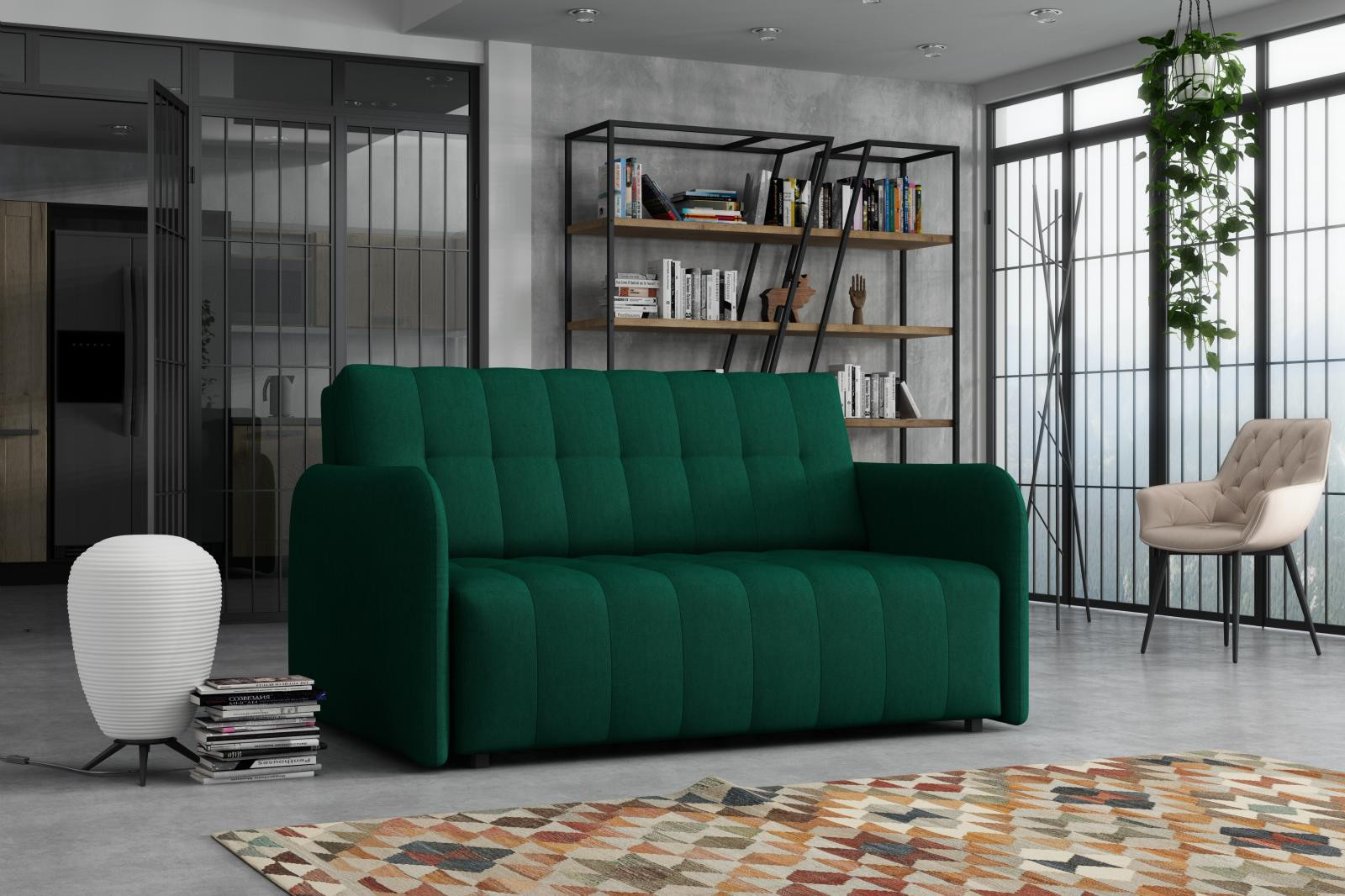 Rozkládací křeslo Vivian je vhodné do dětského, studentského, nebo hostinského pokoje. Jednoduchým rozložením pomocí automatu, získáte lůžko k příležitostnému přespání Vaší návštěvy, nebo kamaráda Vašich dětí. Výplň sedáku tvoří vlnité pružiny v kombinaci s PUR pěnou. Křeslo je potaženo kvalitní látkou s výběrem několika trendy odstínů a velmi elegantním prošíváním. Křeslo disponuje i nepostradatelným úložným prostorem, který využijete např. na deku a polštář. Ostatní vyobrazené doplňky a dekorace nejsou v ceně. Zobrazení barev na fotografii se může od skutečnosti lišit.