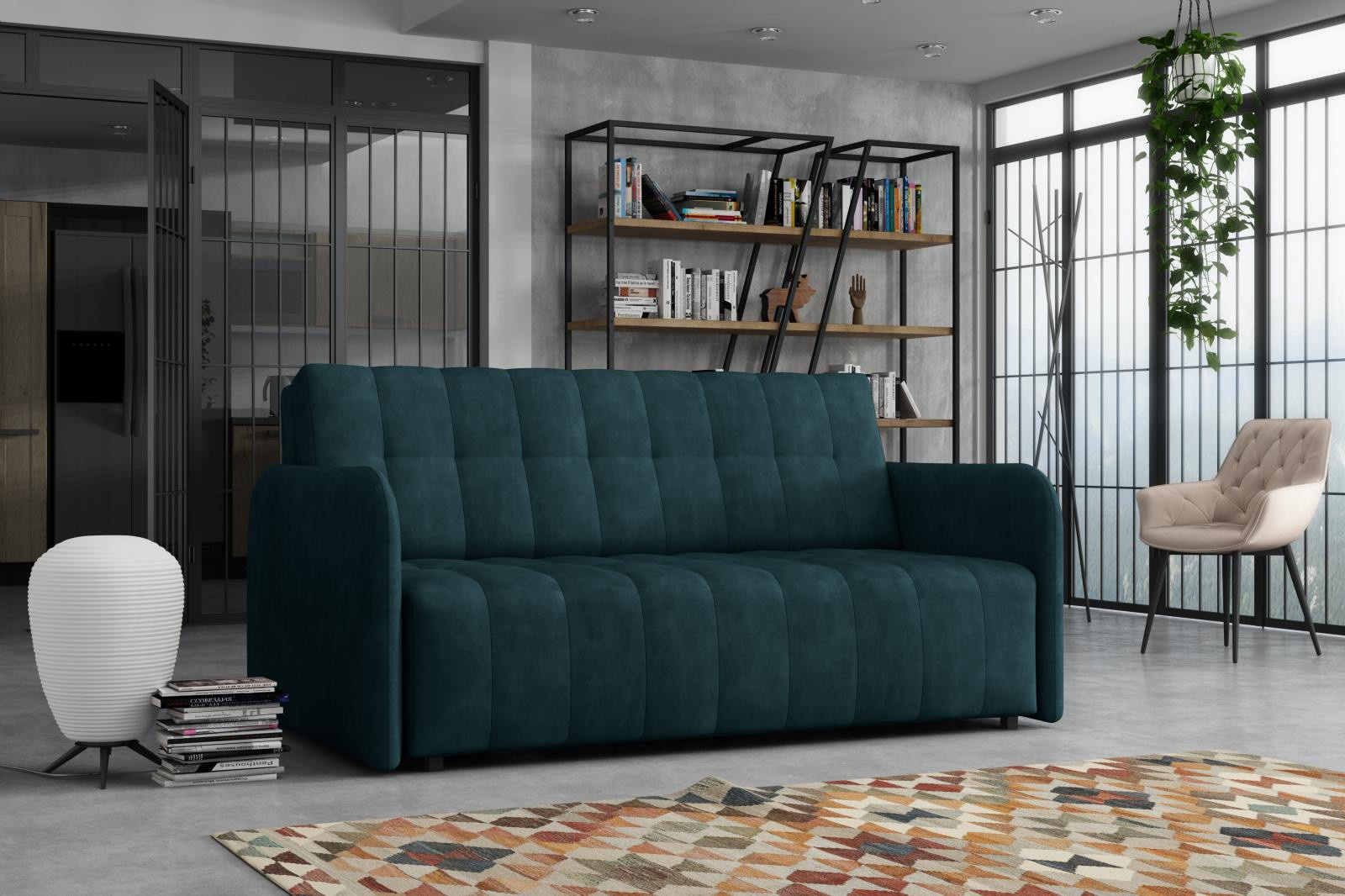 Rozkládací křeslo Vivian je vhodné do dětského, studentského, nebo hostinského pokoje. Jednoduchým rozložením pomocí automatu, získáte lůžko k příležitostnému přespání Vaší návštěvy, nebo kamaráda Vašich dětí. Výplň sedáku tvoří vlnité pružiny v kombinaci s PUR pěnou. Křeslo je potaženo kvalitní látkou s výběrem několika trendy odstínů a velmi elegantním prošíváním. Křeslo disponuje i nepostradatelným úložným prostorem, který využijete např. na deku a polštář. Ostatní vyobrazené doplňky a dekorace nejsou v ceně. Zobrazení barev na fotografii se může od skutečnosti lišit.