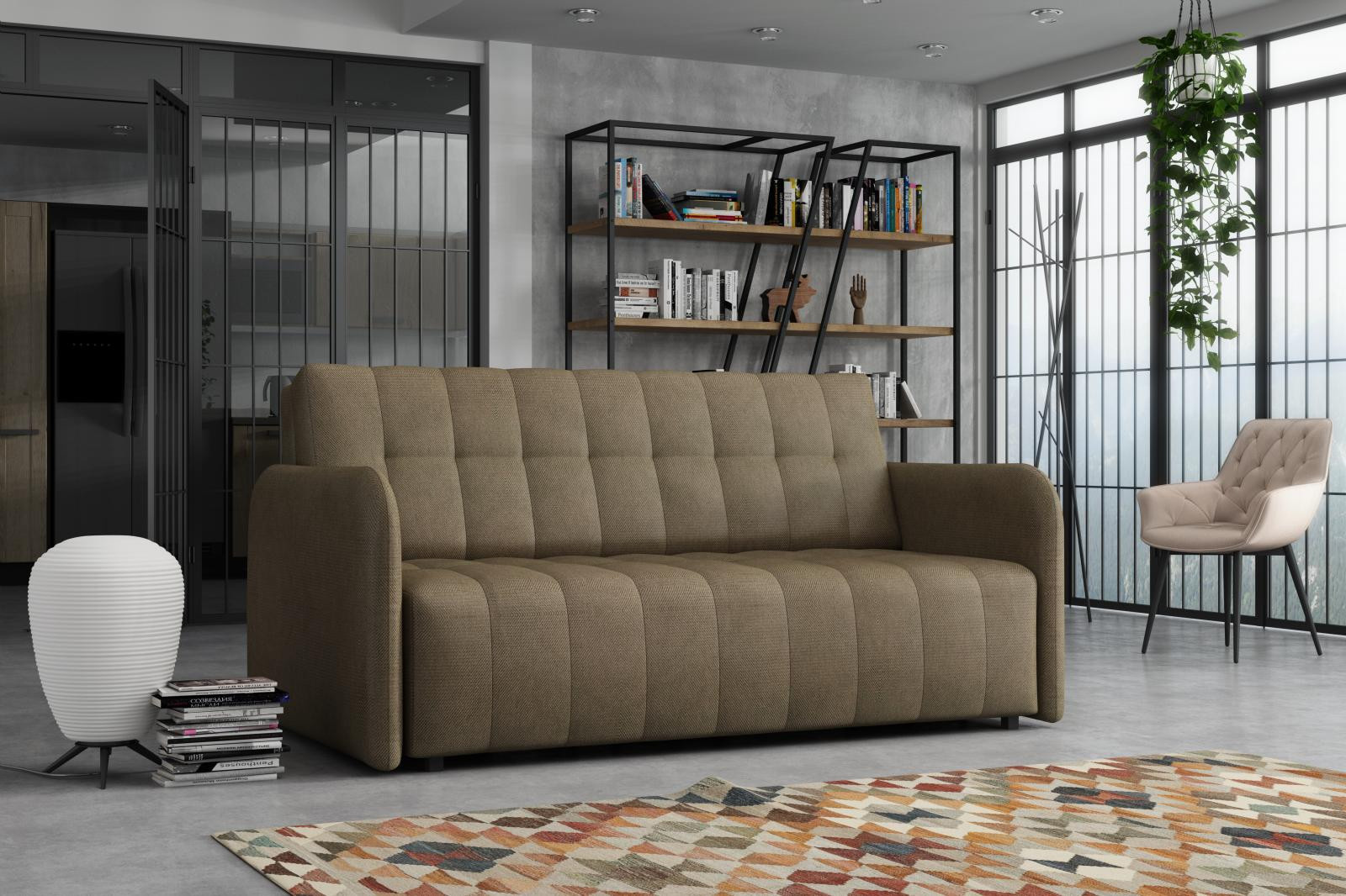 Rozkládací křeslo Vivian je vhodné do dětského, studentského, nebo hostinského pokoje. Jednoduchým rozložením pomocí automatu, získáte lůžko k příležitostnému přespání Vaší návštěvy, nebo kamaráda Vašich dětí. Výplň sedáku tvoří vlnité pružiny v kombinaci s PUR pěnou. Křeslo je potaženo kvalitní látkou s výběrem několika trendy odstínů a velmi elegantním prošíváním. Křeslo disponuje i nepostradatelným úložným prostorem, který využijete např. na deku a polštář. Ostatní vyobrazené doplňky a dekorace nejsou v ceně. Zobrazení barev na fotografii se může od skutečnosti lišit