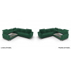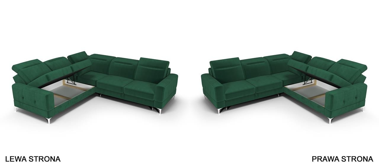 Rohová sedačka má nastavitelné, vícestupňové opěrky hlavy, chromované ozdobné nožky, sedáky s ozdobným prošíváním, které jsou vyrobeny na vlnitých pružinách a vysoce elastické pěně, což zajišťuje vysoký komfort používání a zabraňuje deformaci nejčastěji používaných ploch. Stranu rohové sedačky určuje úložný prostor na lůžkoviny. Kontejner vpravo - pravá strana, kontejner vlevo - levá strana (stojíc čelem k nábytku).